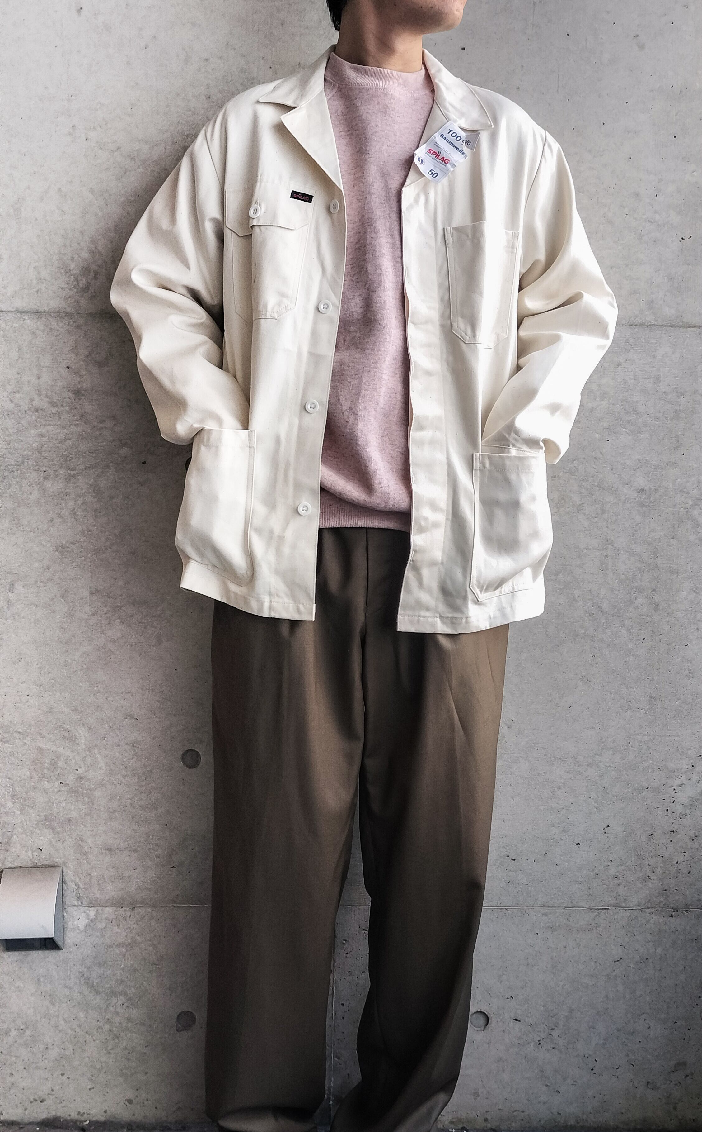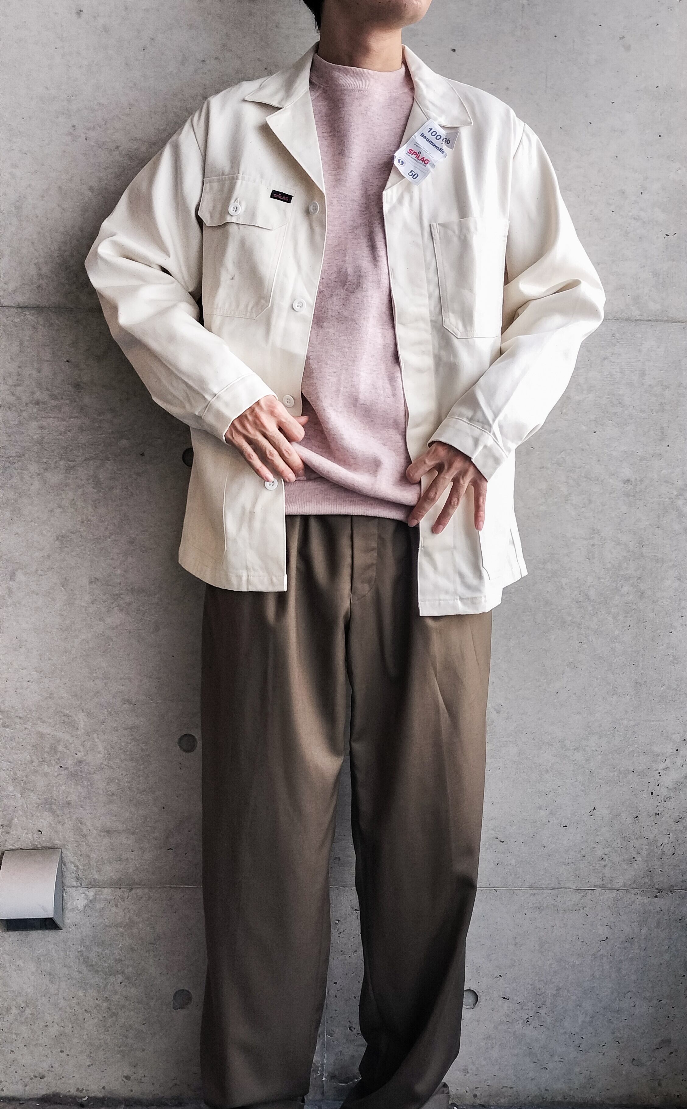 ユーロ物のカバーオール。タグ付きデッドストックです。生成りでネップが入った生地。淡い色のトップスと合わせたいです。開襟タイプなのも◎。