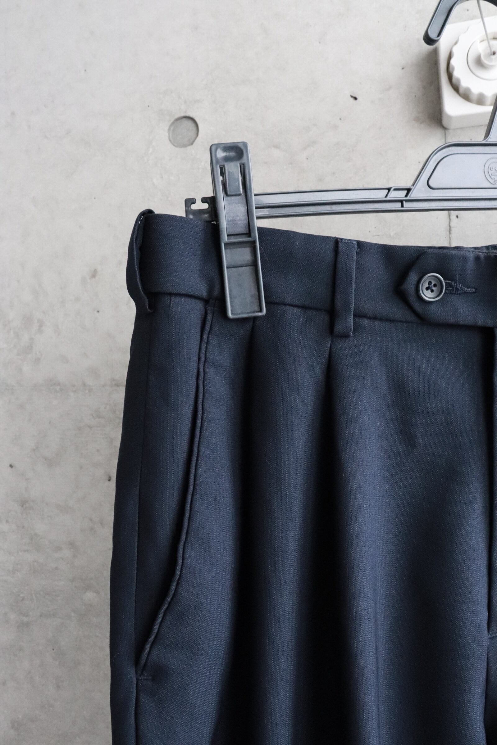 ネイビーの2タックスラックス。適度な光沢感でドレープのある生地。シルエットにかなり拘って入荷してます。ブラウン系のトップスと合わせると玄人感出ます。一本持っておいて間違いない一着です。