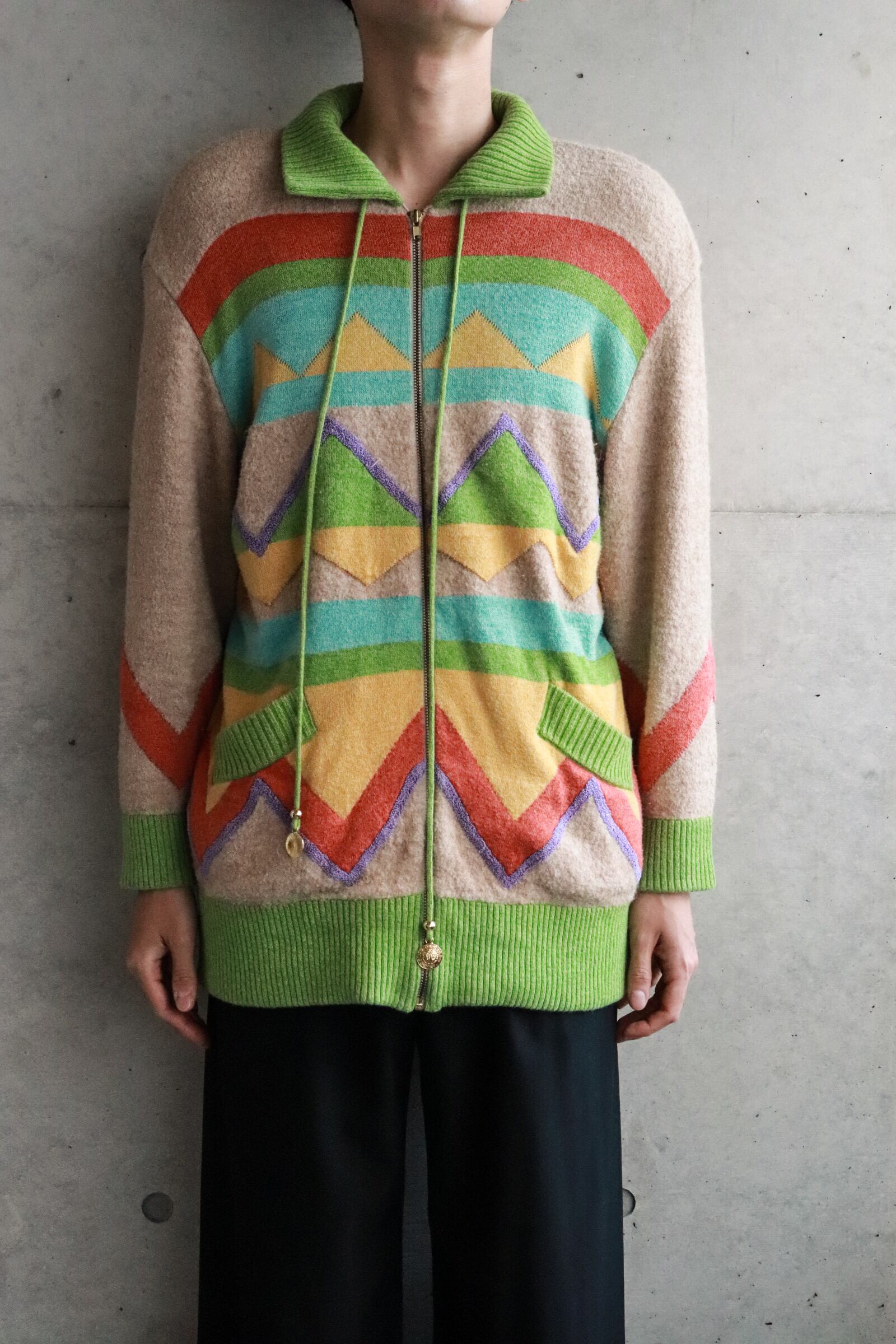 マルチカラーのカーディガン。ジップアップタイプで襟ニ長いドローコード付きが特徴です。生地感の違う切替デザイン。レザーとかの少しハードな物とのスタイリングもオススメです。