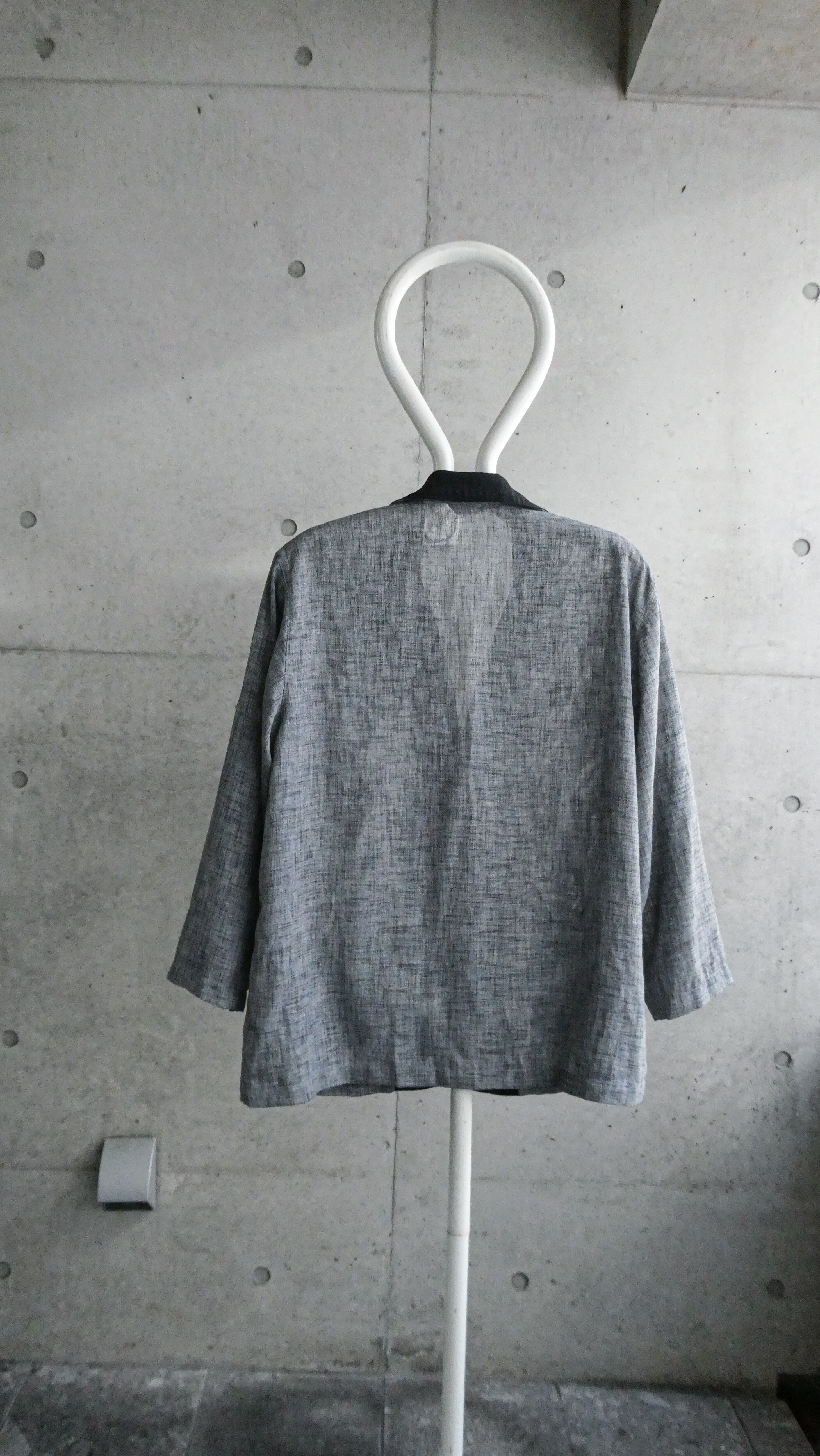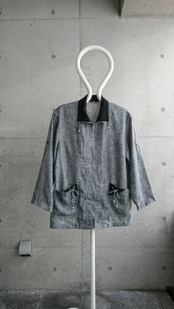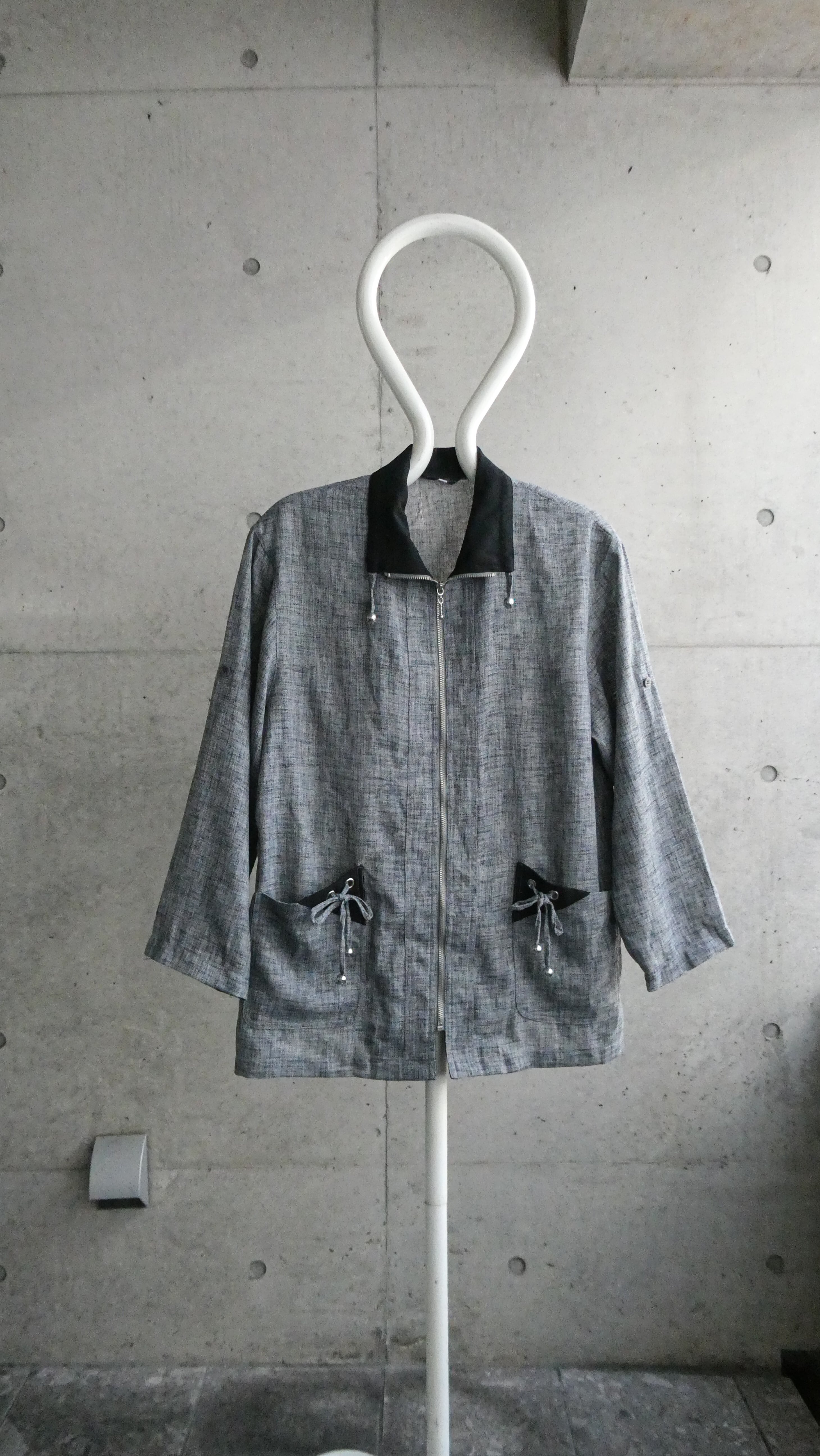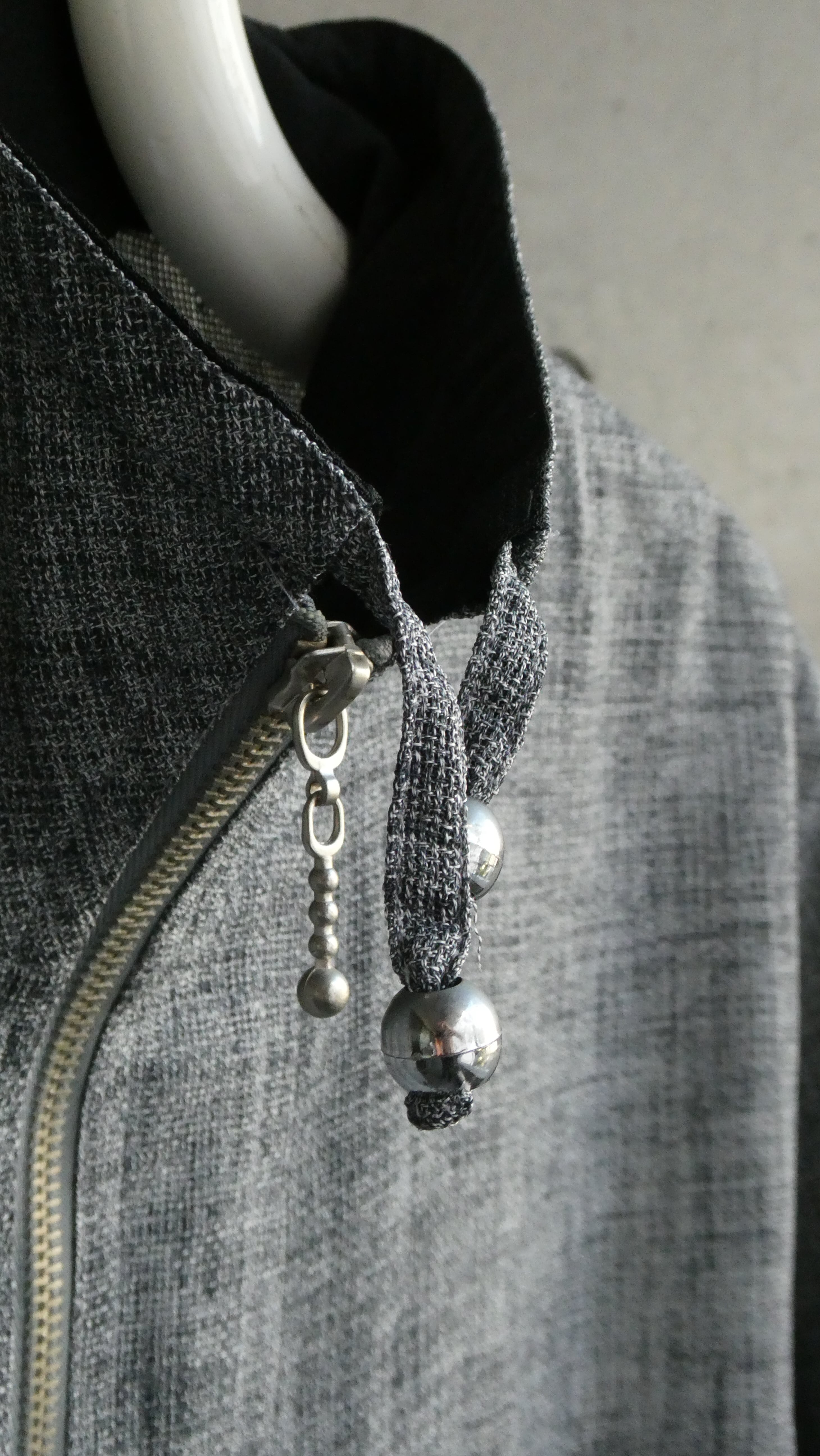 ポケットに紐とメタルボールが付いたデザイン。襟裏、ポケットがブラックの切替です。紐のメタルパーツが凄くいいアクセントです。中々グレーベースでいいライトアウターは見つからないです。