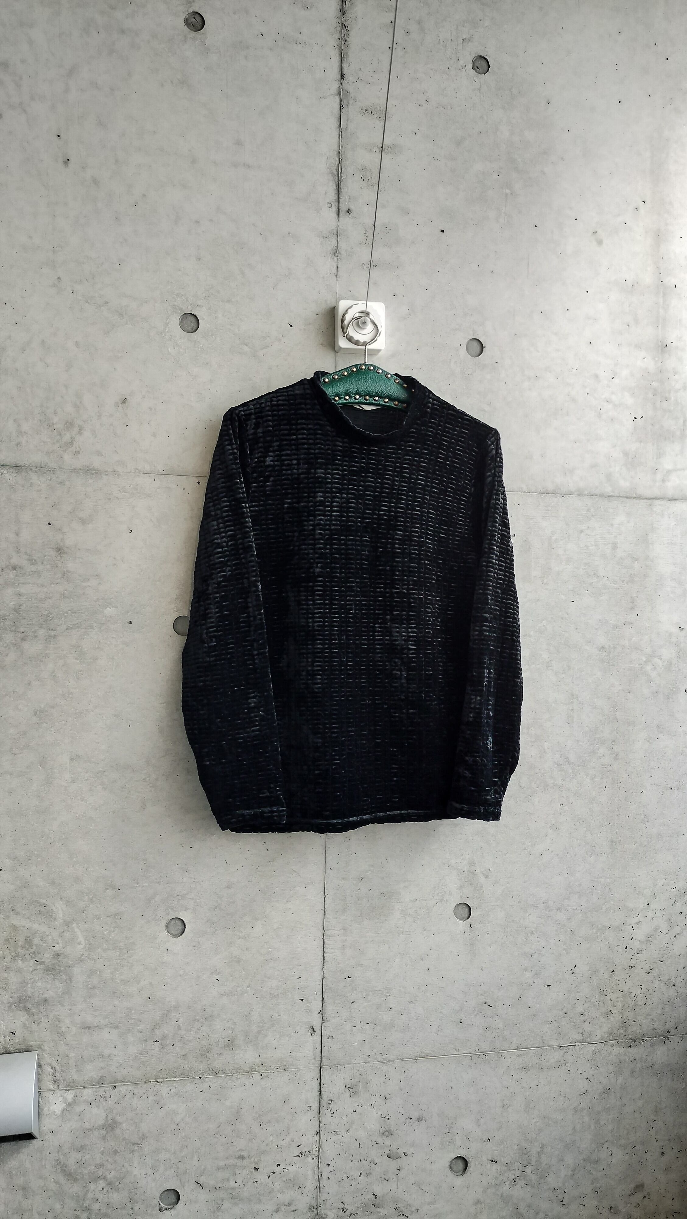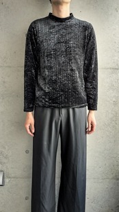 ブラックのモックネックシャツ。インナーで着るご提案です。ブラックのベロア生地。特殊なコーデュロイパターンのような生地です。モックネックで襟からチラッと見せるだけでアクセントです。