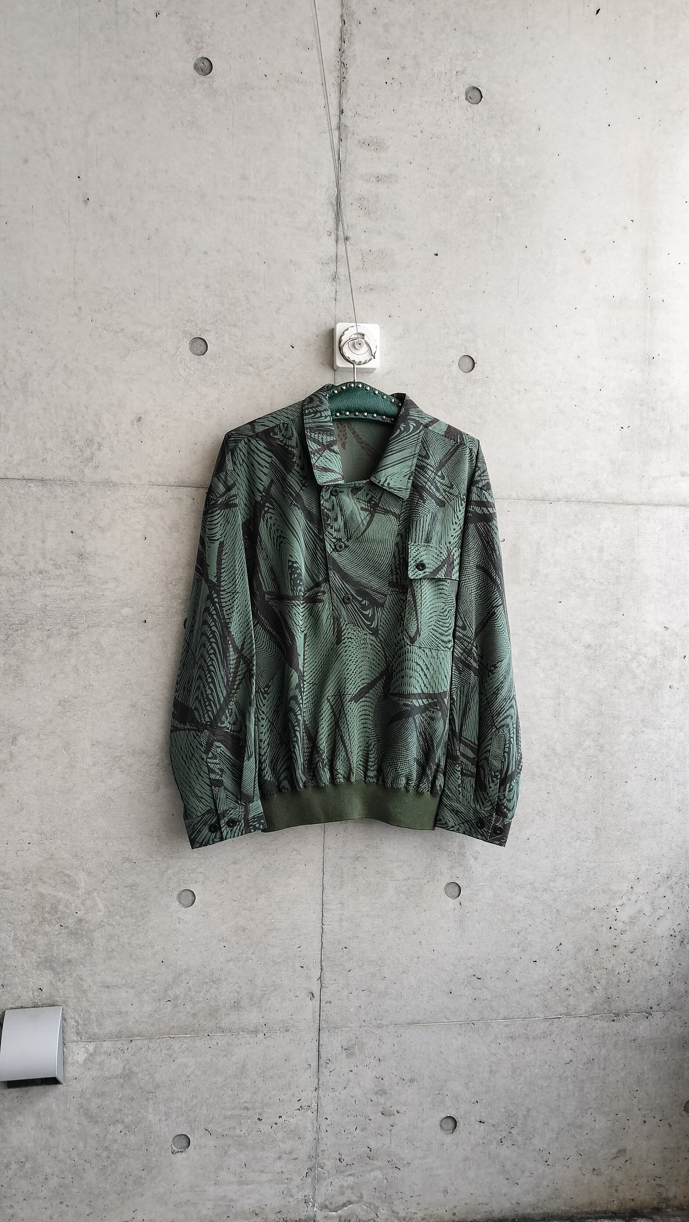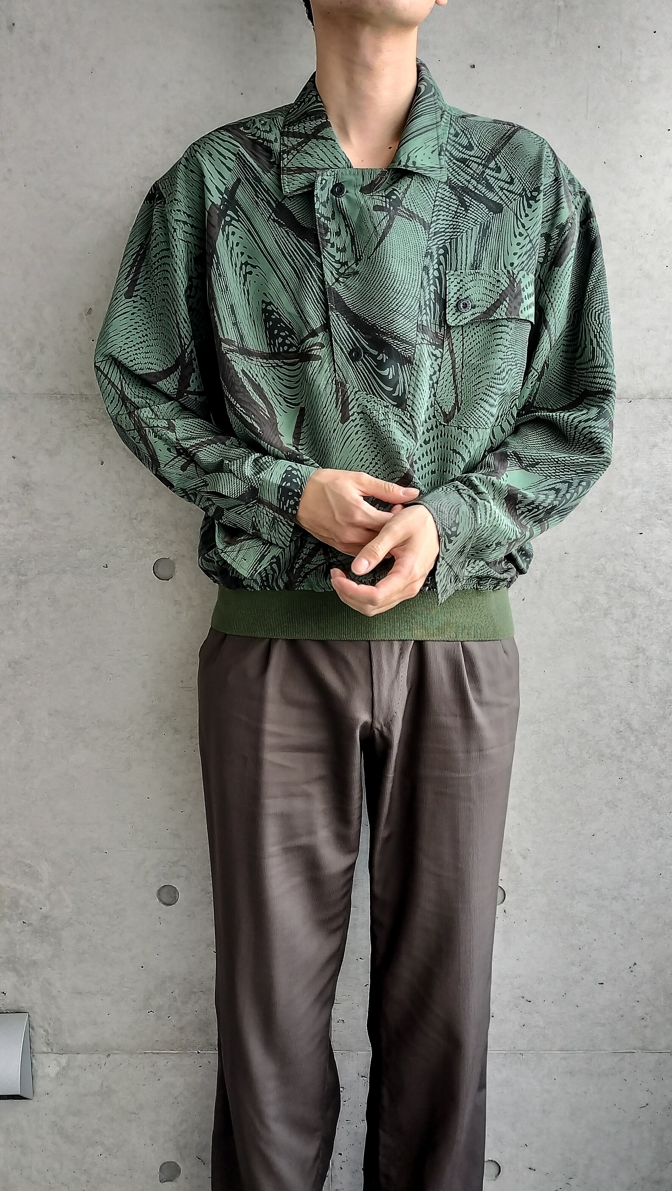 変形のプルオーバーシャツ。襟が開襟タイプに開けれる変形パターン。ボタンで閉めることも可能です。プルオーバーらしく、しっかり裾はリブタイプ。緩く着れるサイズです。