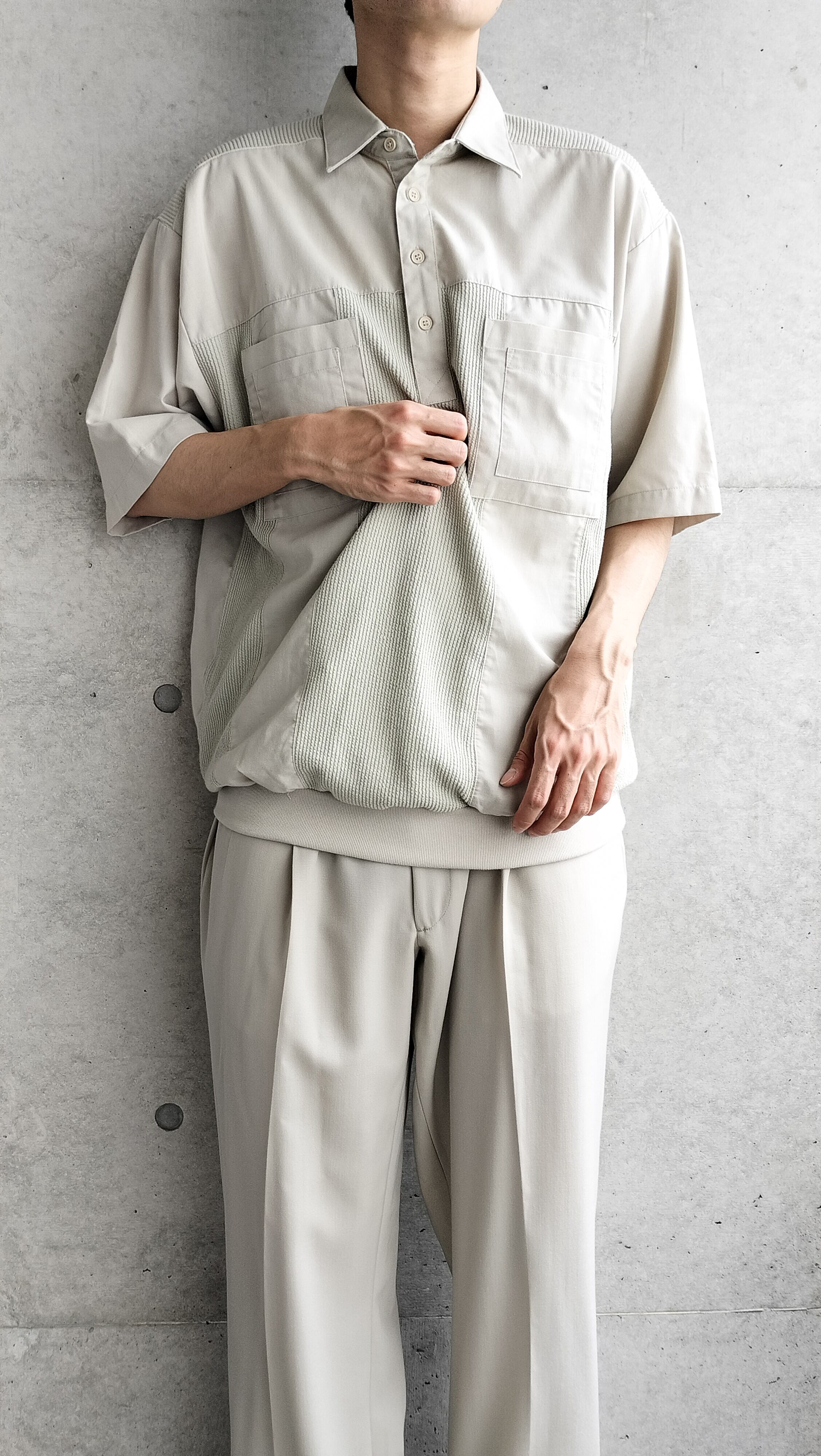 スペシャル。生地切替のプルオーバーシャツ。畝のある生地が切替になったデザインです。ハーフボタンタイプなのも最高です。裾リブタイプでシルエットも極上です。