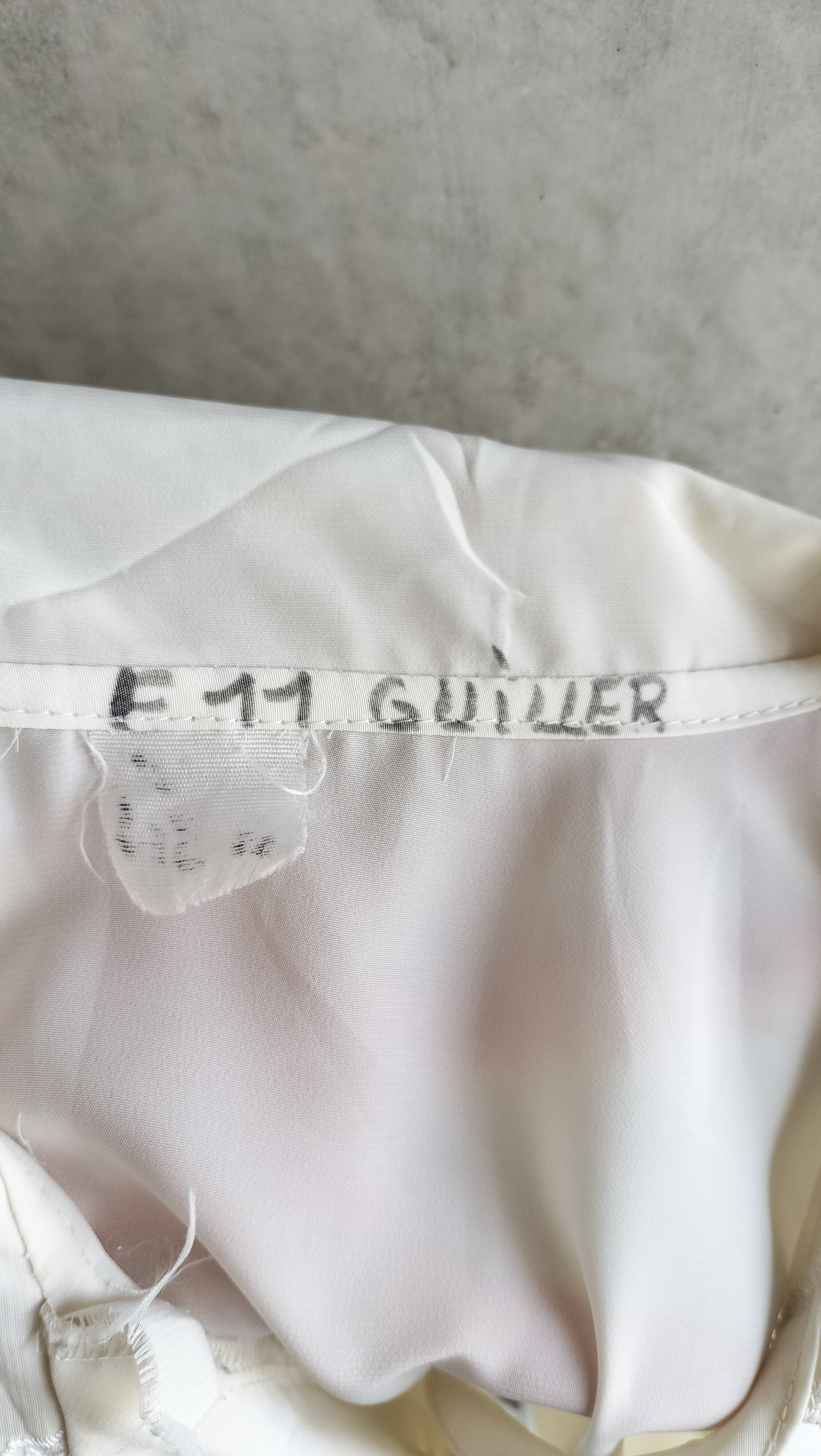 白の刺繍シャツ。前たて、襟に刺繍入りのデザインです。比翼仕立てです。サラッと一枚で決まる白シャツです。襟裏に英字サイン入りで、凄く古着らしくていいです。