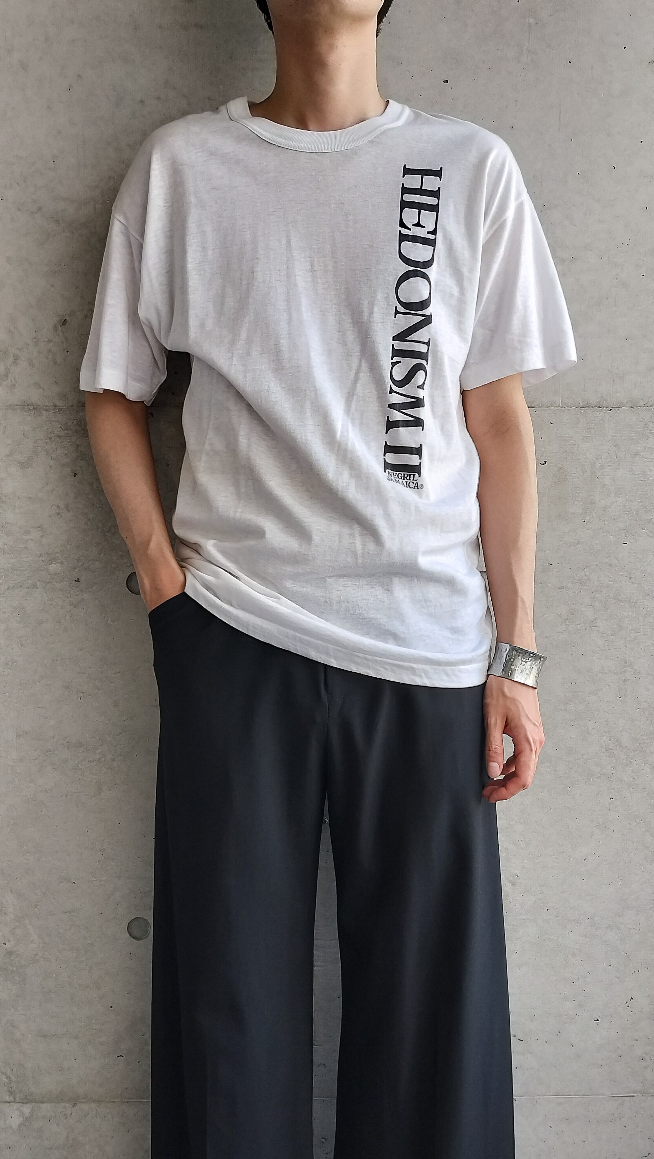 "HEDONISM" 快楽主義。ヴィンテージで貴重な縦プリントロゴ。調べるとジャマイカのリゾートホテルのヴィンテージTシャツ。ヴィンテージ特有のクタッとしたコットン生地。染み込みプリント。袖はシングルステッチ。珍しいジャマイカ製です。