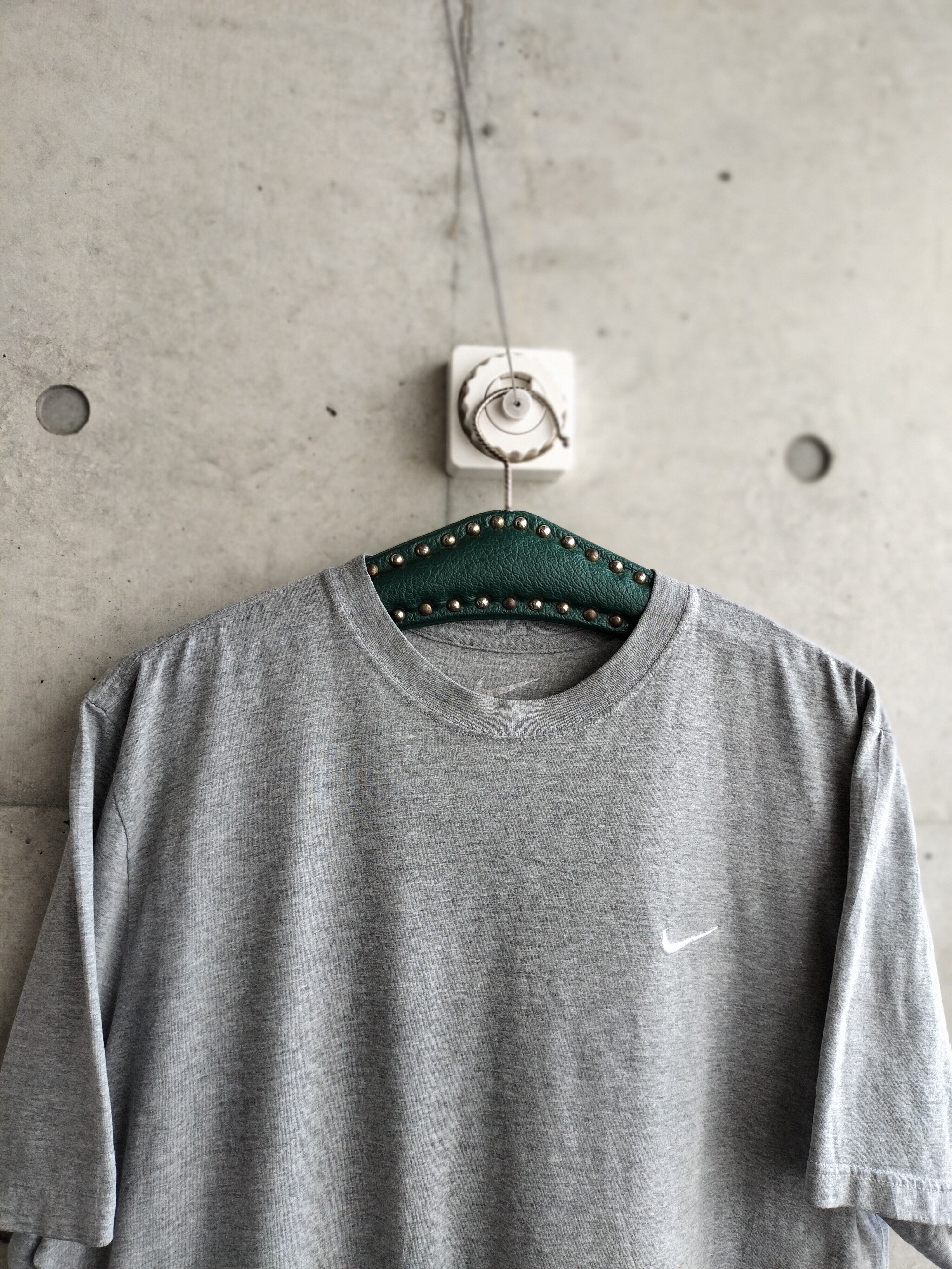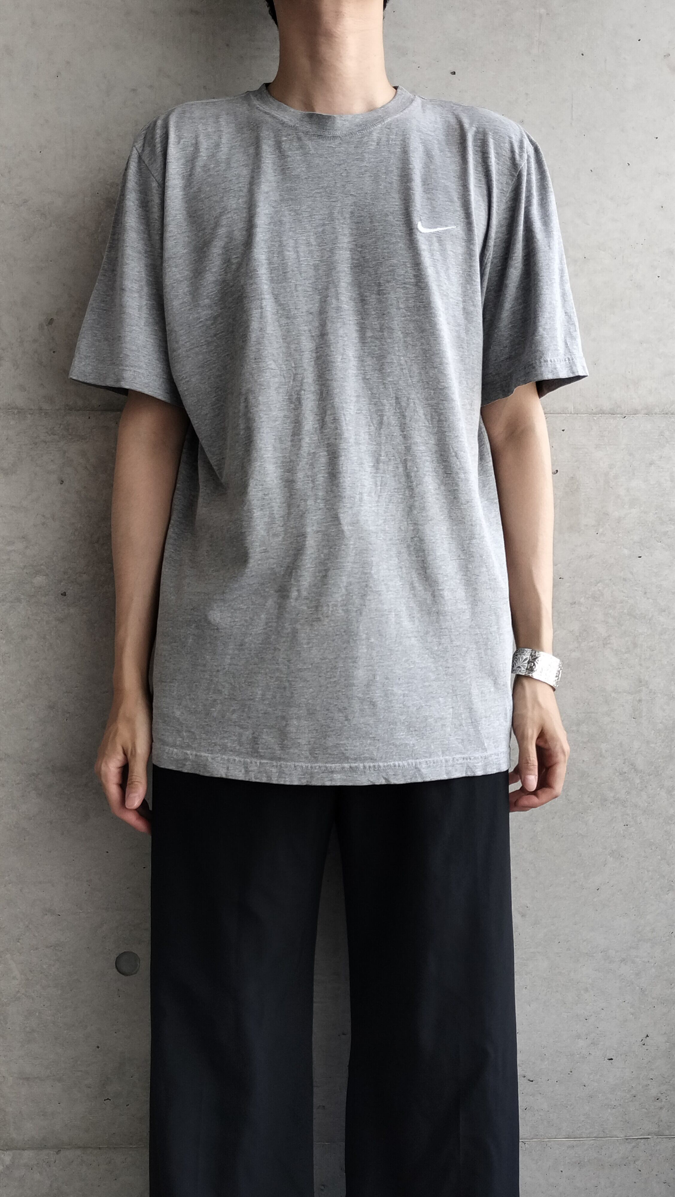 ナイキの杢グレーTシャツ。胸には白の刺繍スウォッシュロゴ入りです。白系のシャツに合せると案外新鮮で、あまりやってる人見ないです。