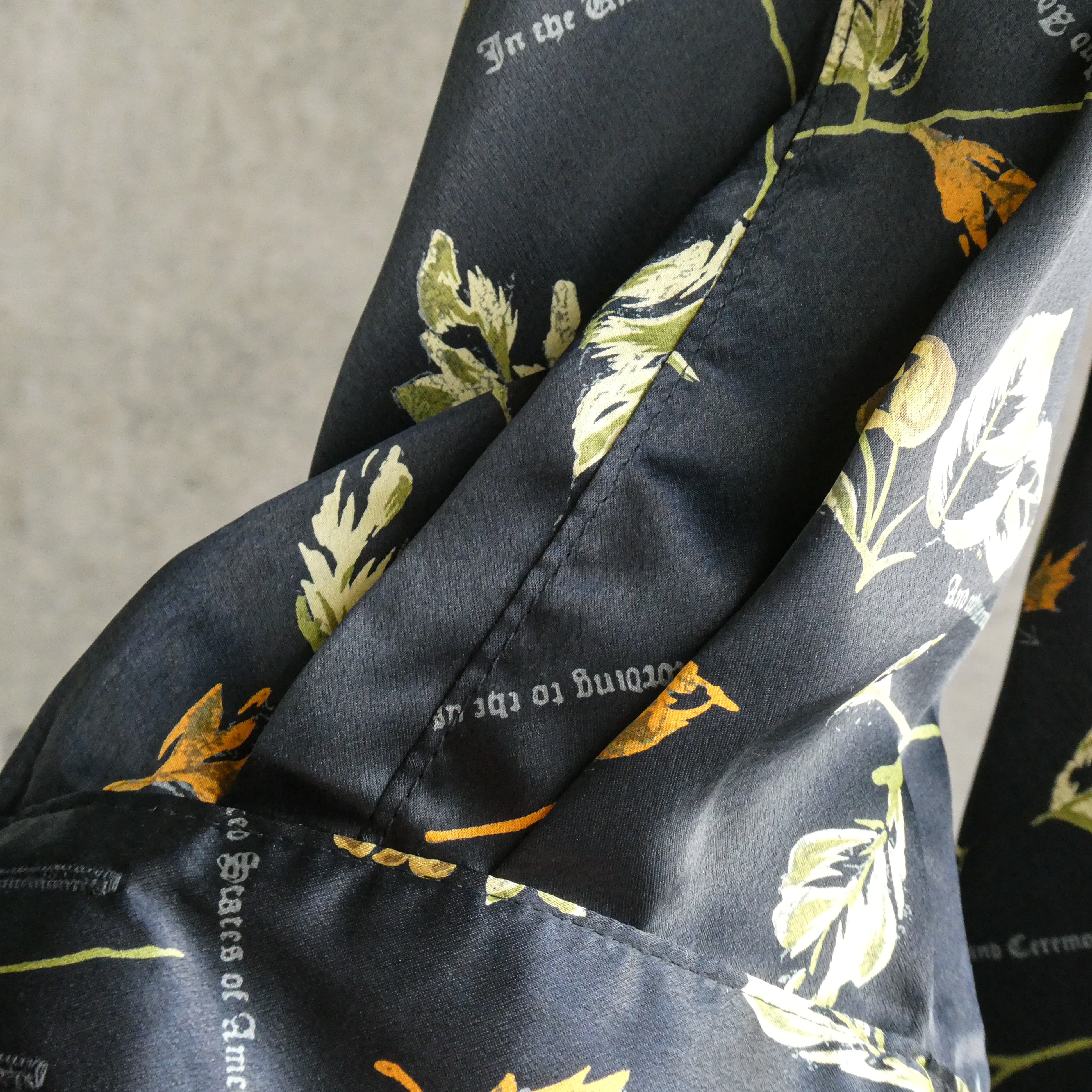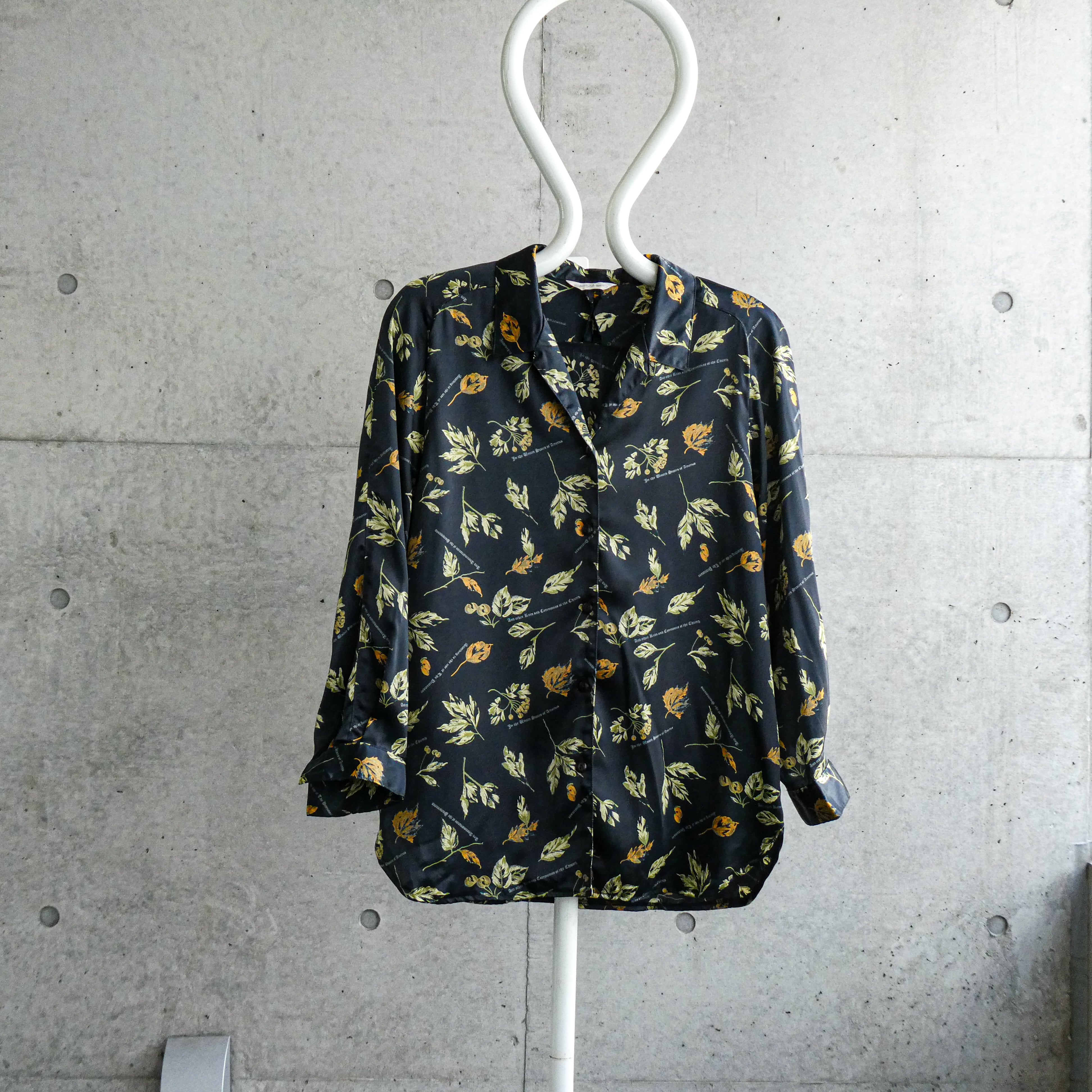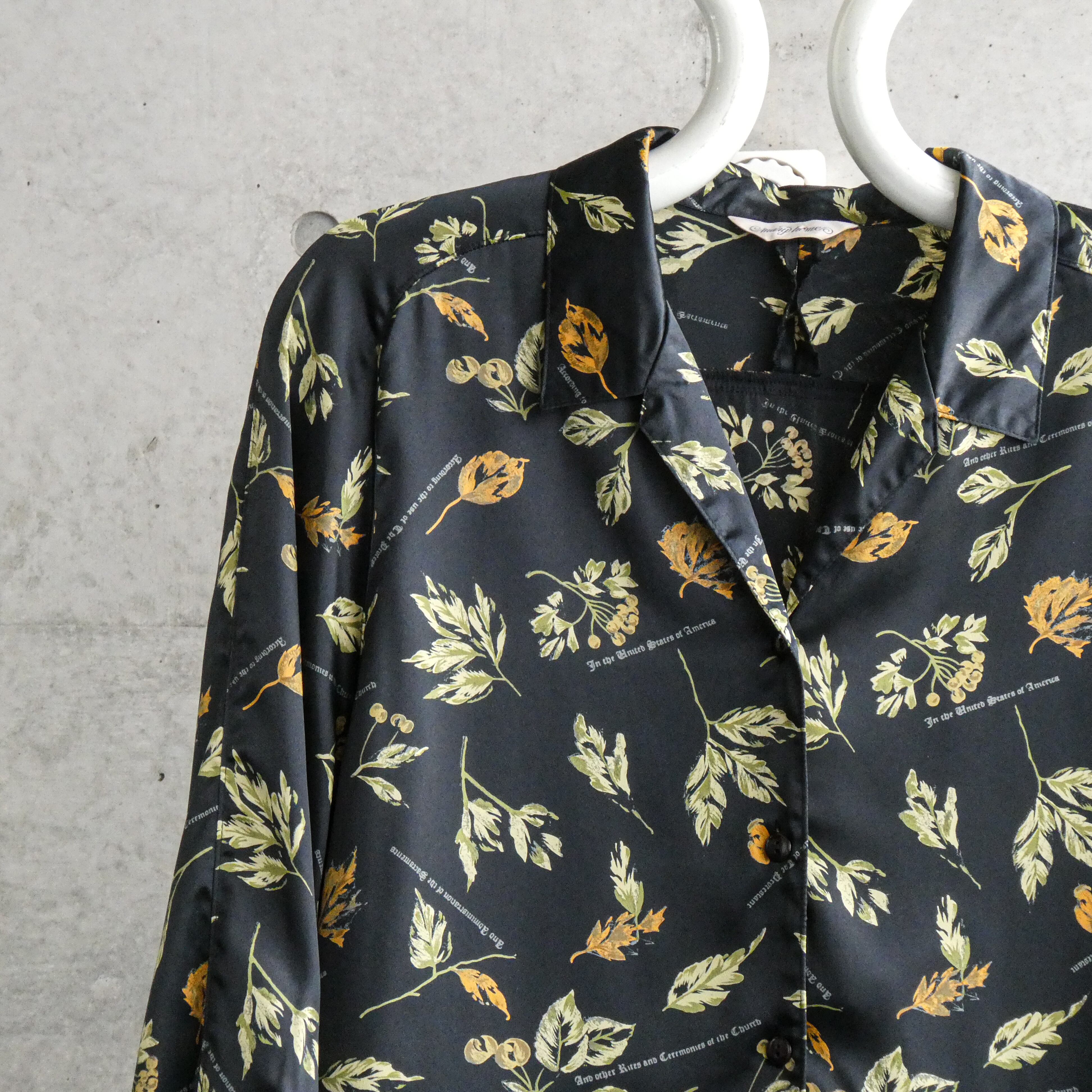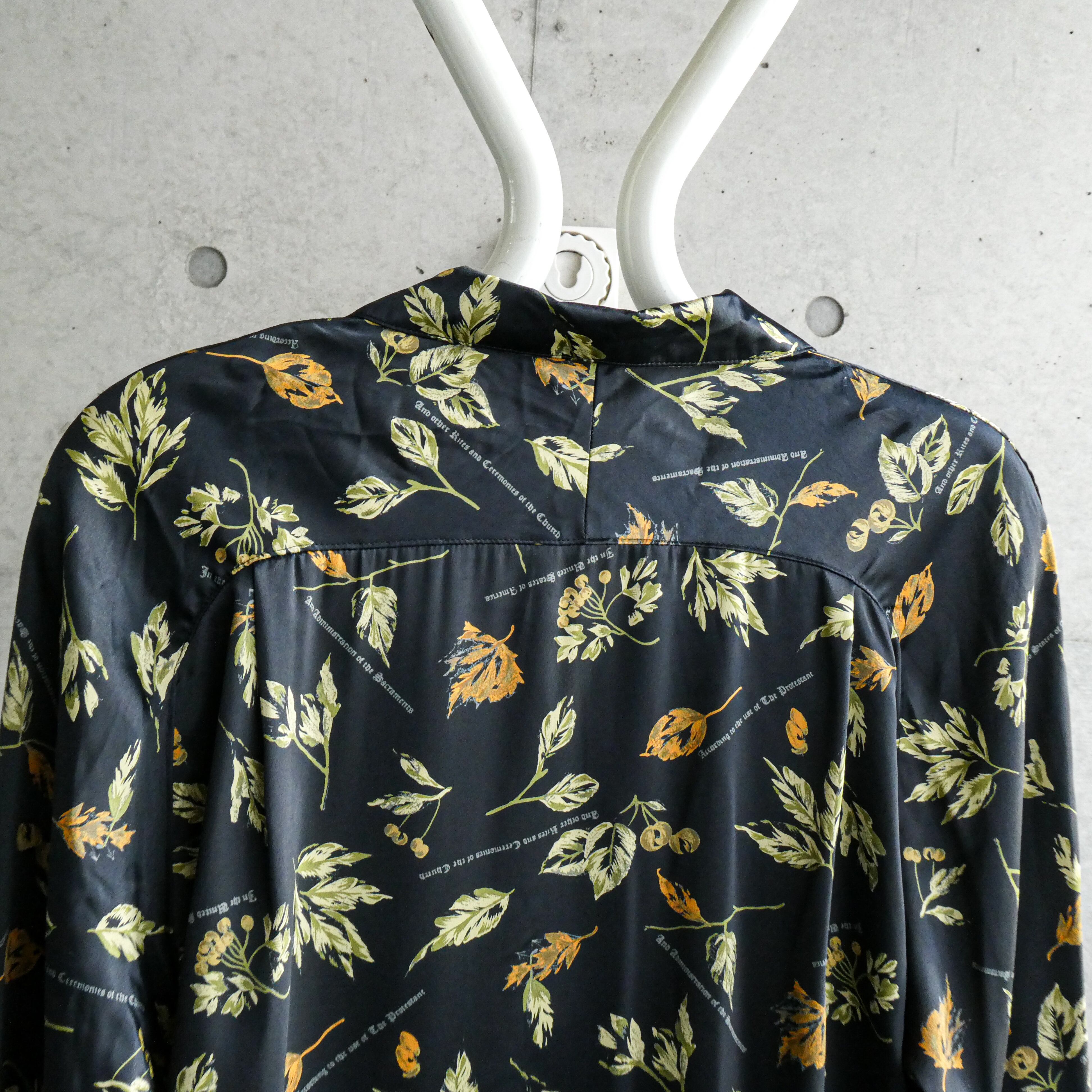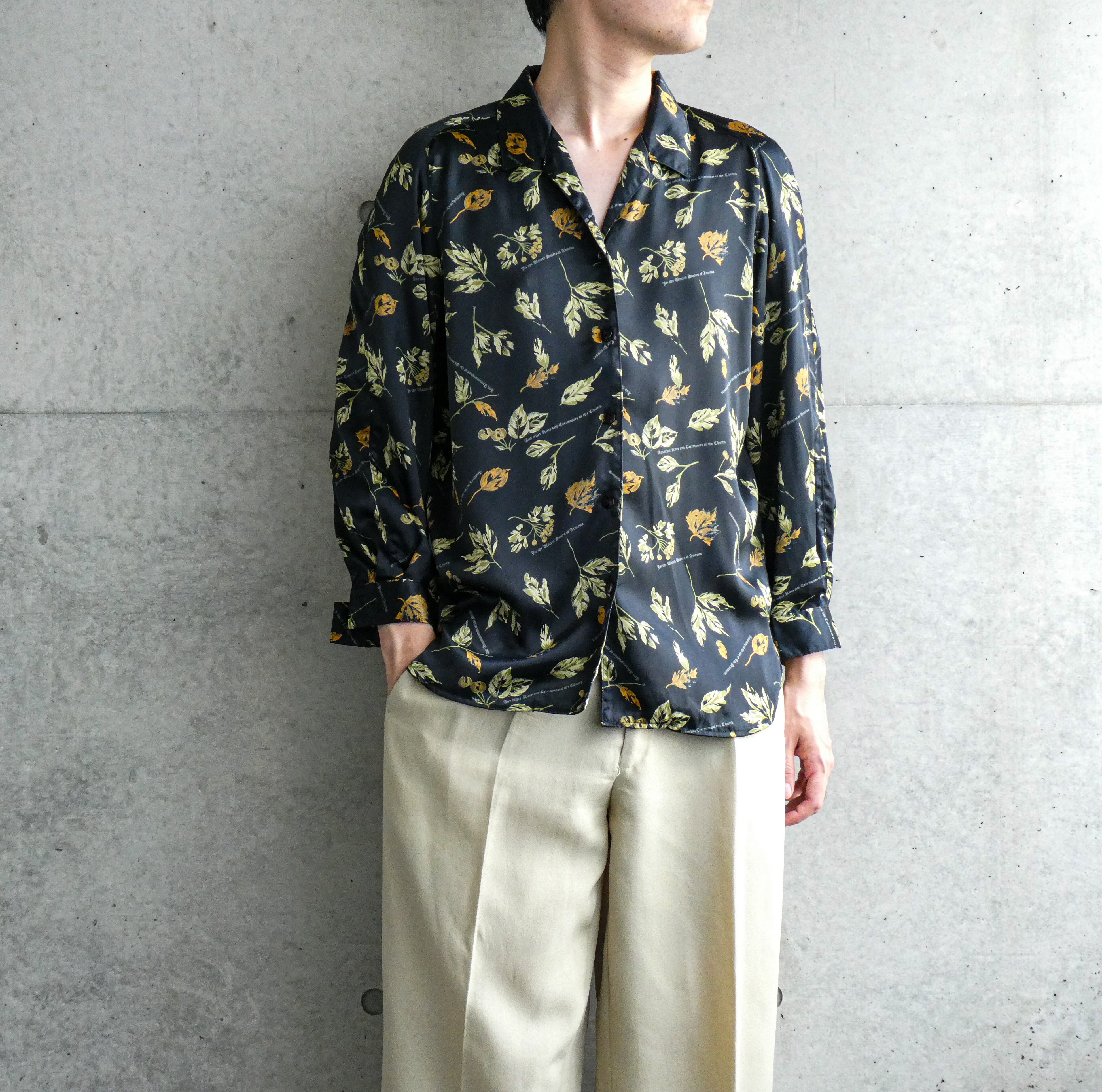 ブラックのドレープシャツ。黒ベースに花柄デザイン。開襟パターンです。総柄に英語のレタードが入ってる柄なのが良くてピックしました。シルエットも良くてシンプルにカッコいいです。