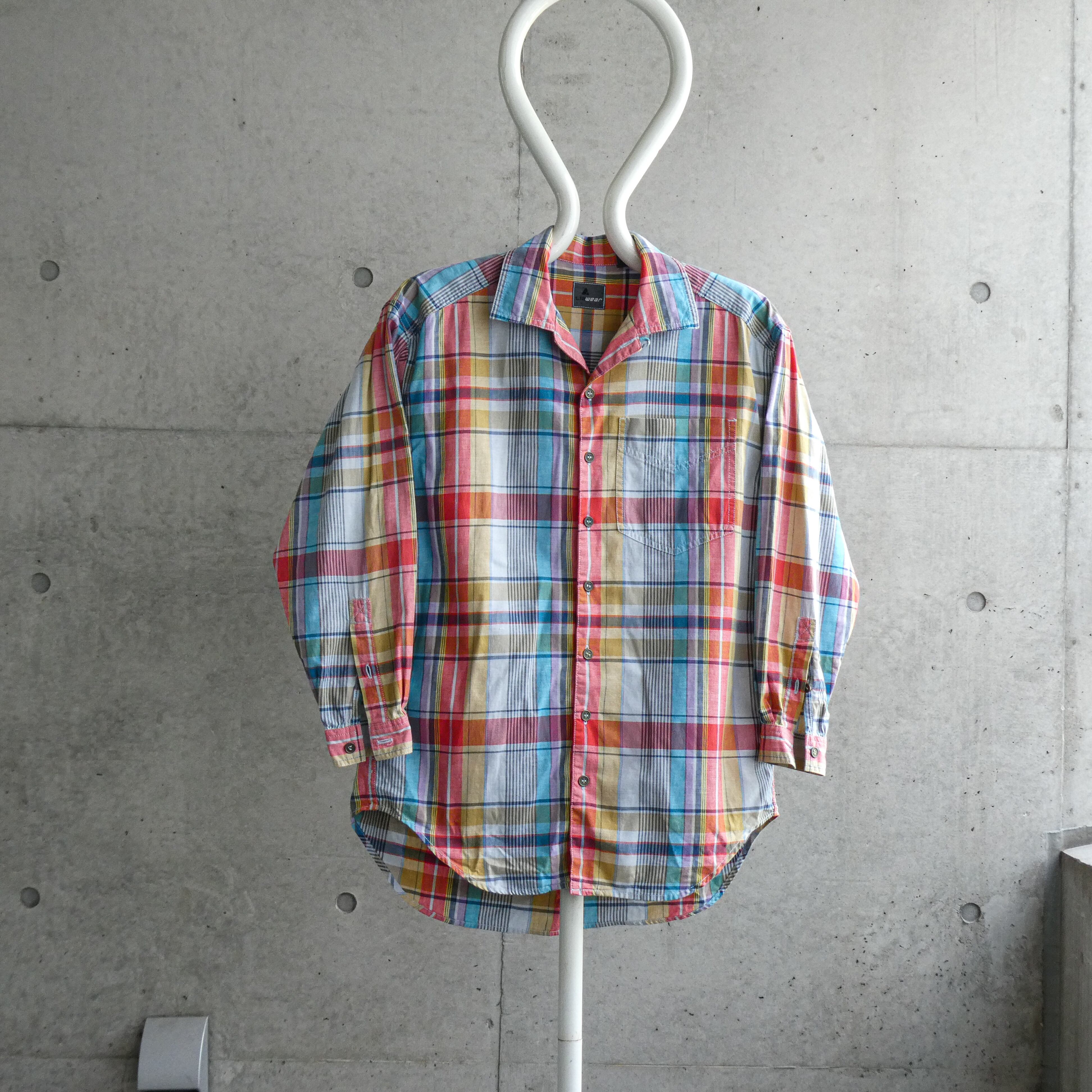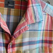 マドラスチェックの開襟シャツ。特徴的なのは背面の鬼ギャザー。こういう捻りが効いたチェックシャツが凄く気になります。開襟でマドラスチェックも探すと中々ないです。ボタンはメタルボタンです。