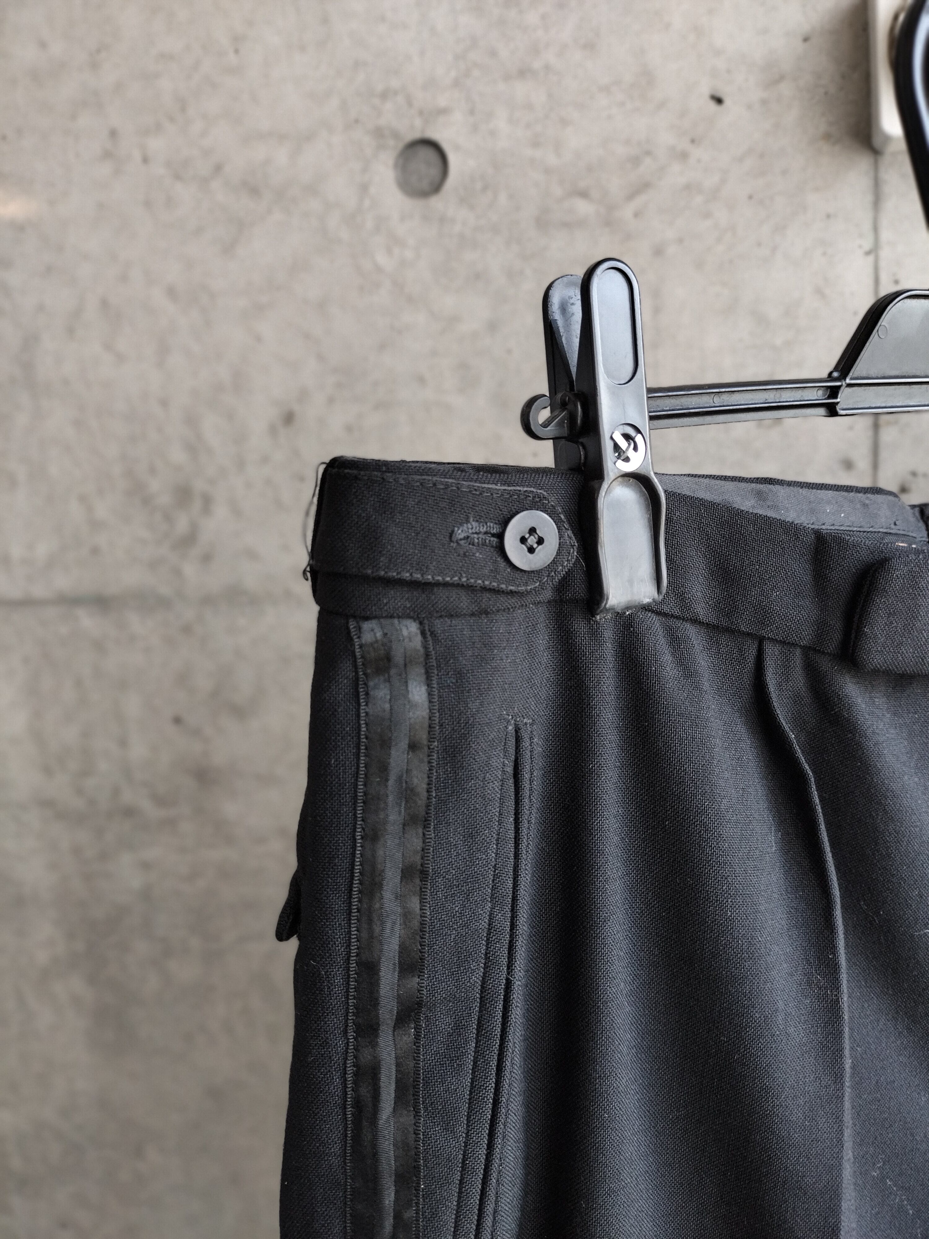 ブラックのウールスラックス。鈍い光沢のあるブラック。サイドライン入りです。後ろはフラップポケット。サイドアジャスター式。ウエスト大きめの方向けのサイズです。