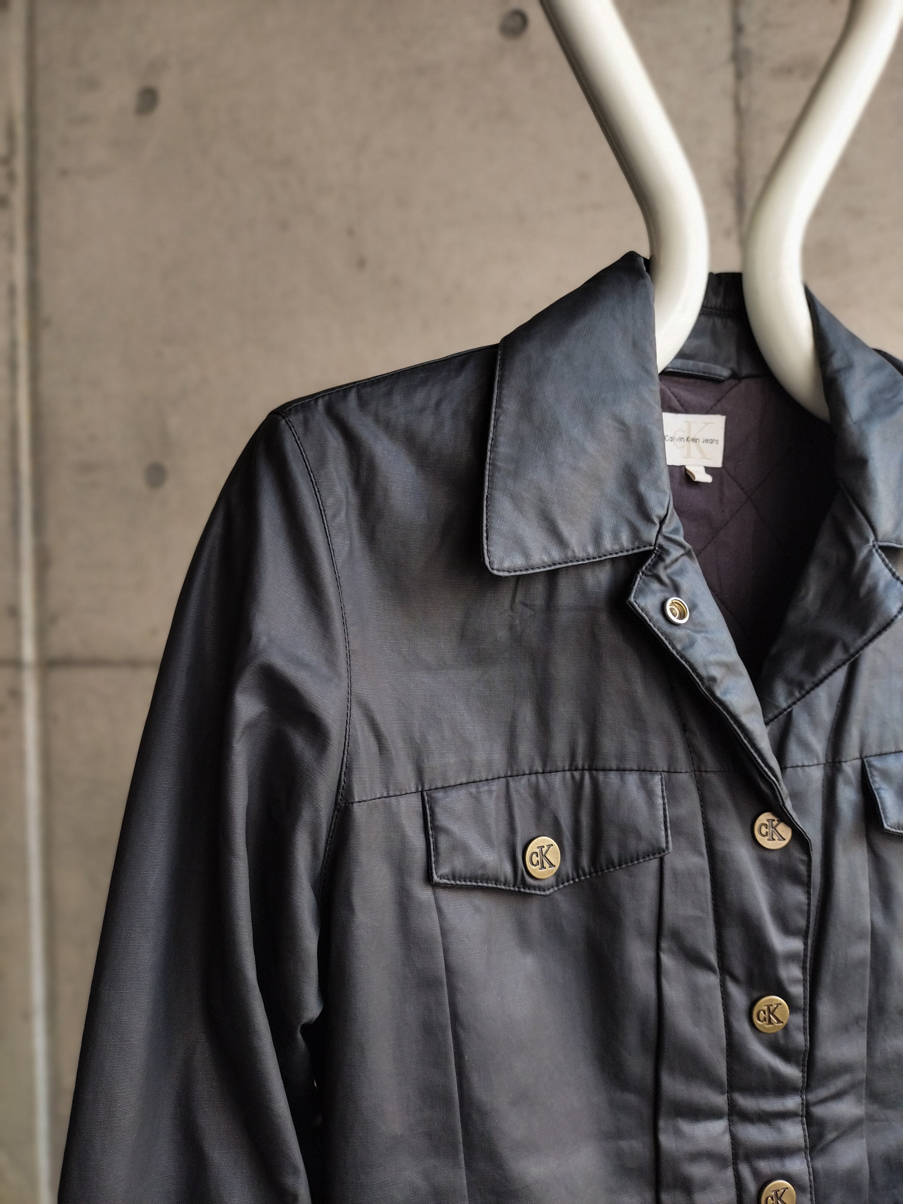 Calvin Klein Jeansのコート。コーティングされたような独特な光沢の生地です。ボタンは全てロゴ入りオリジナル。ロング丈です。レディース向けサイズです。