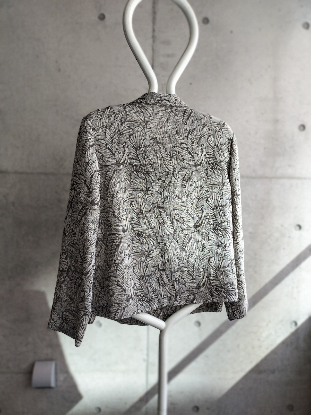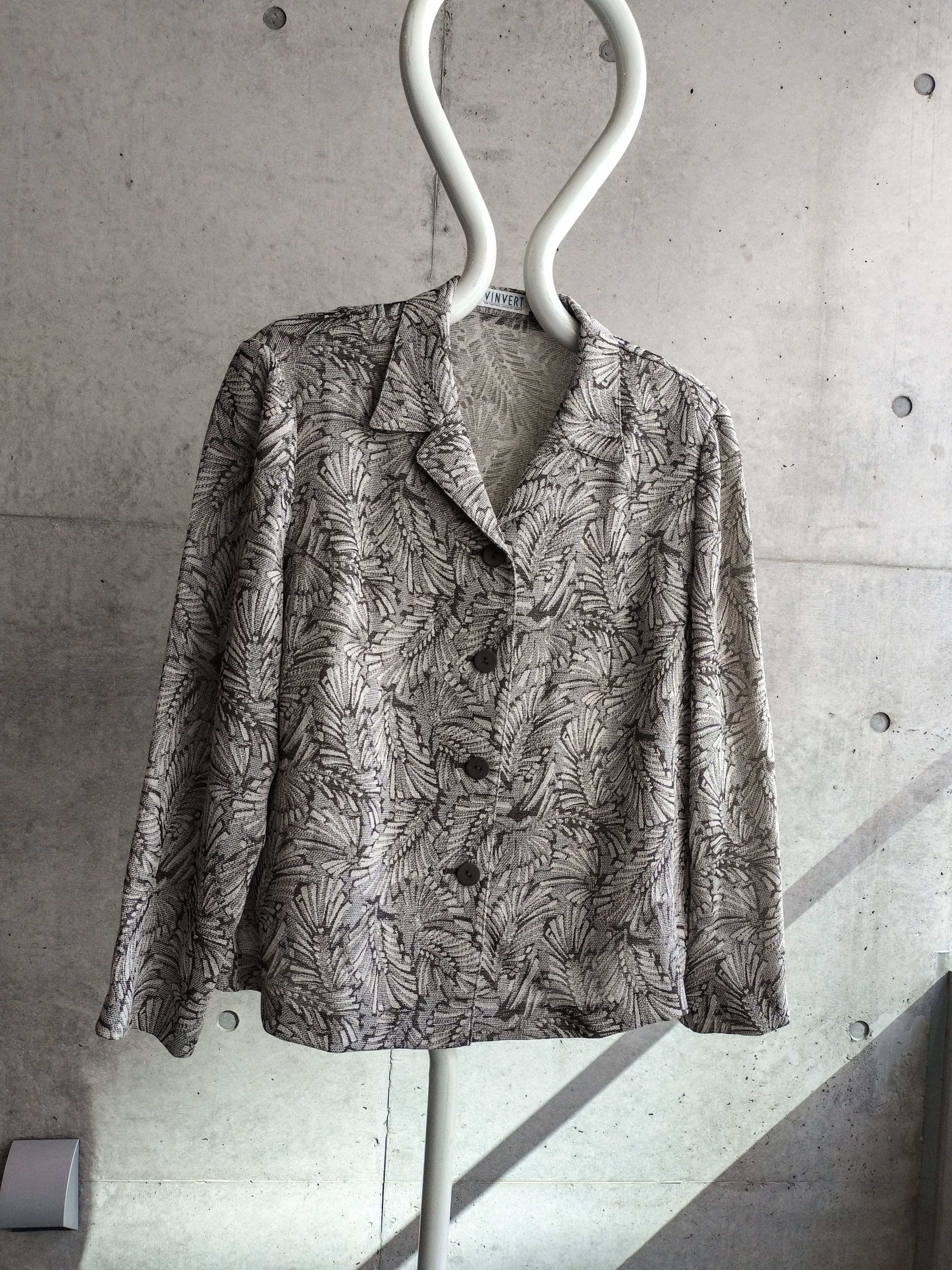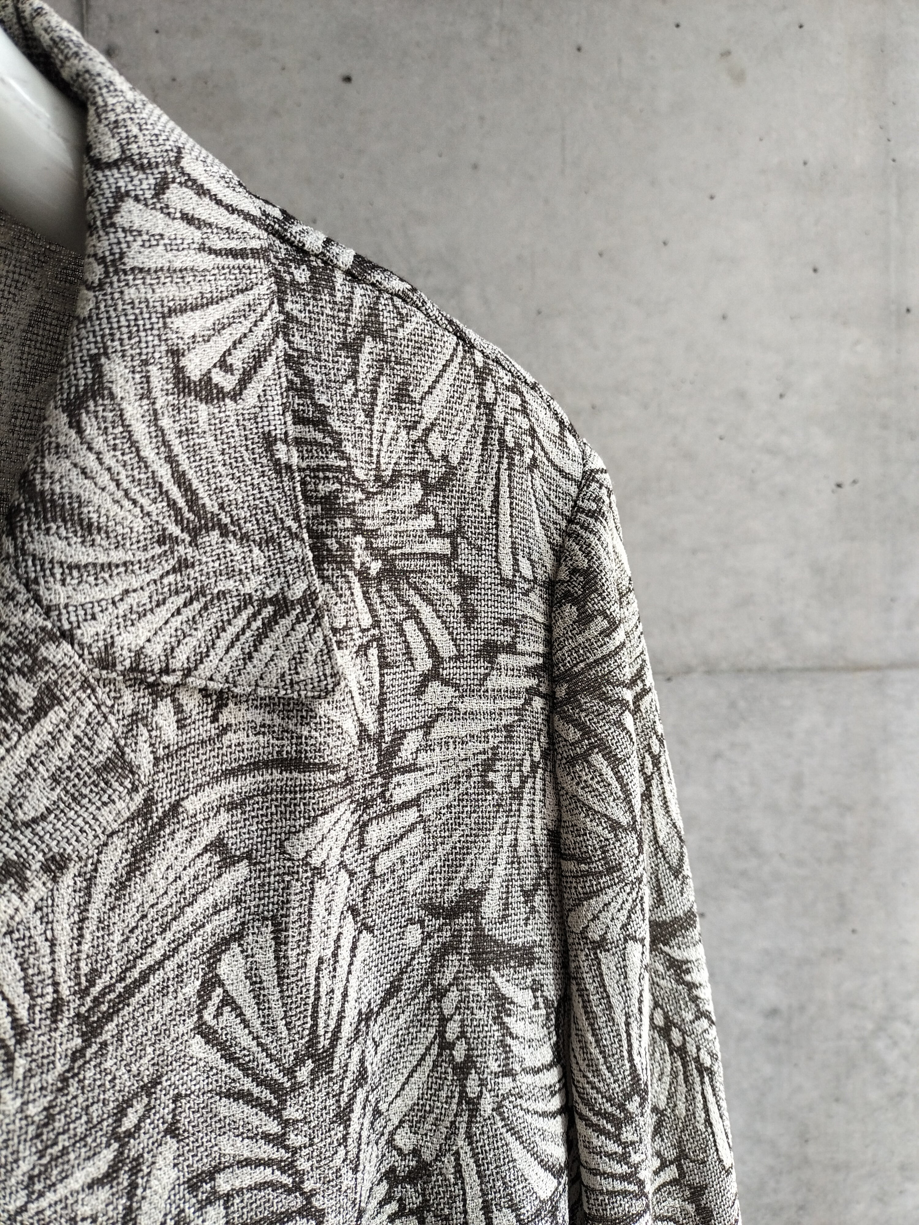 チャコールカラーのデザインシャツ。草木柄。シャリ感のある生地でシワが付きにくいです。開襟でシルエットも美しいです。