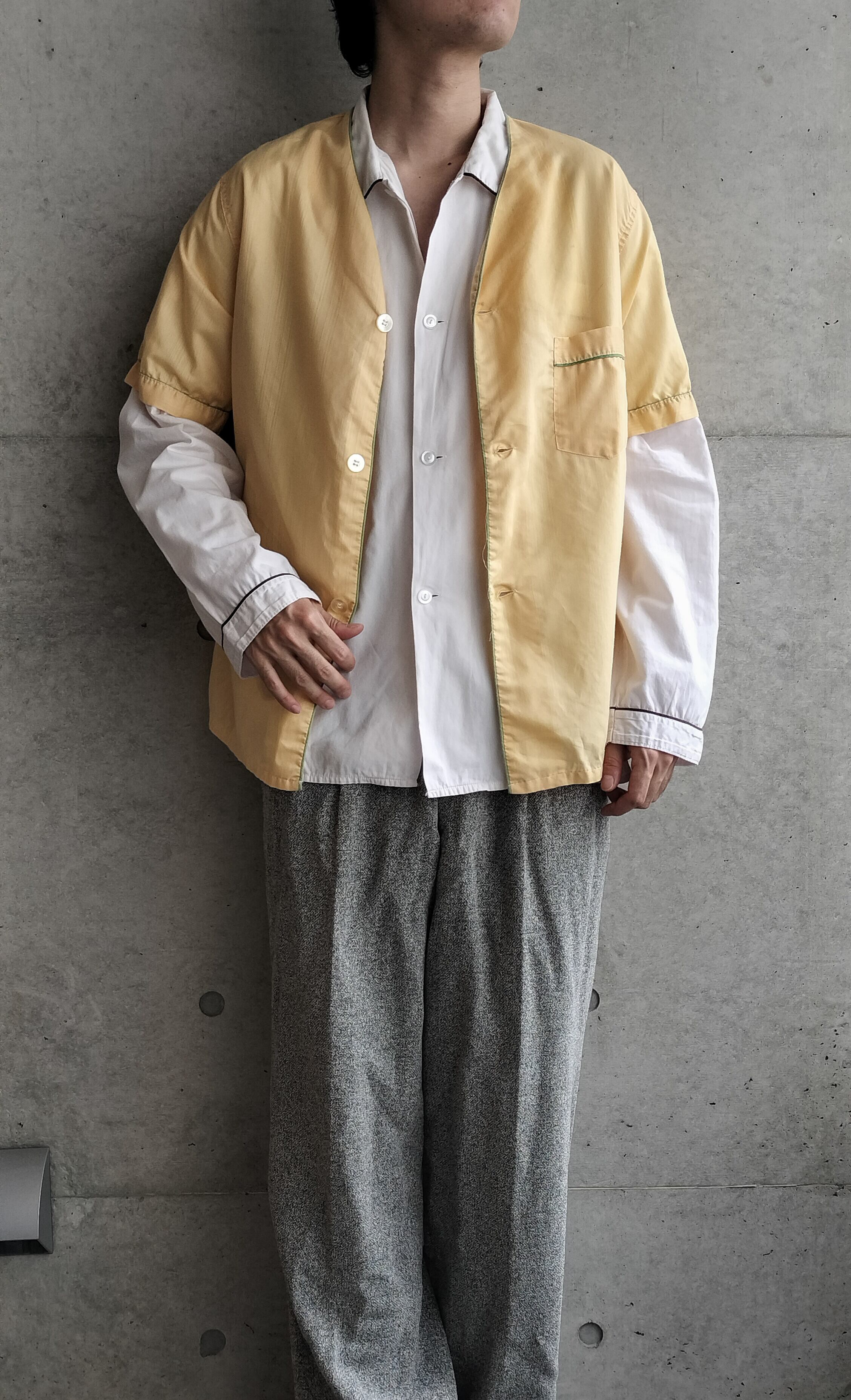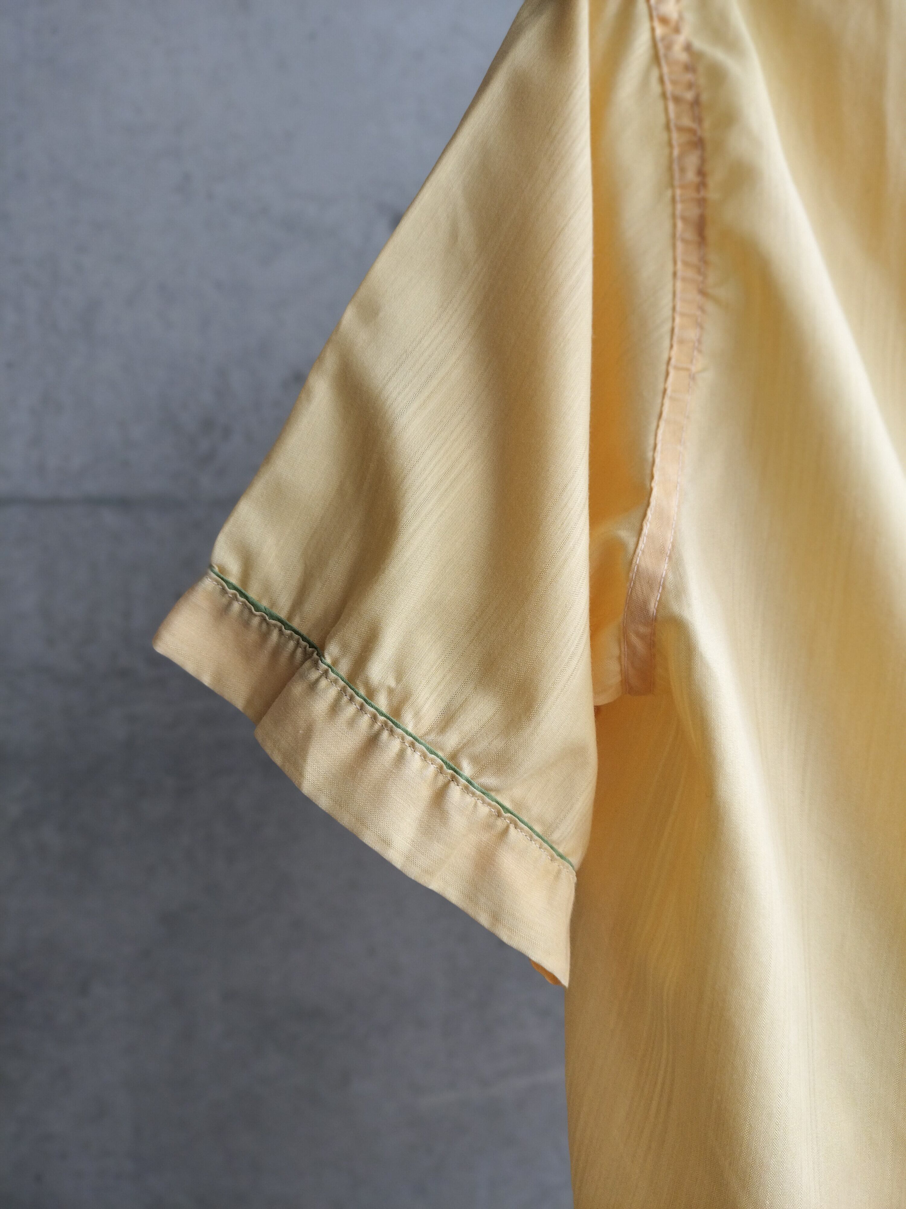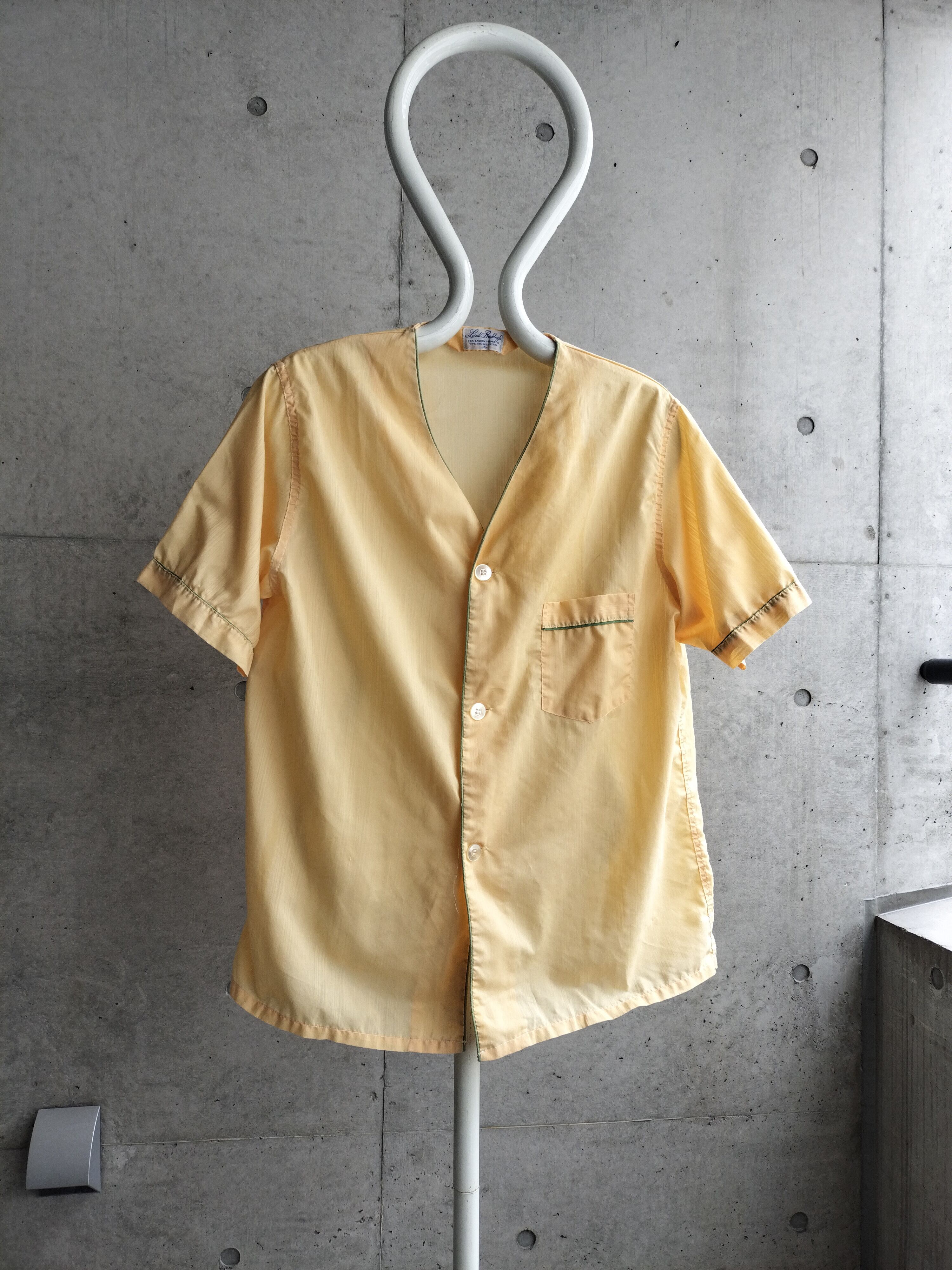 ビタミン色のパジャマシャツ。珍しい半袖でグリーンのパイピング。先日入荷のパジャマシャツとのレイヤードもオススメです。シルエットも極上です。