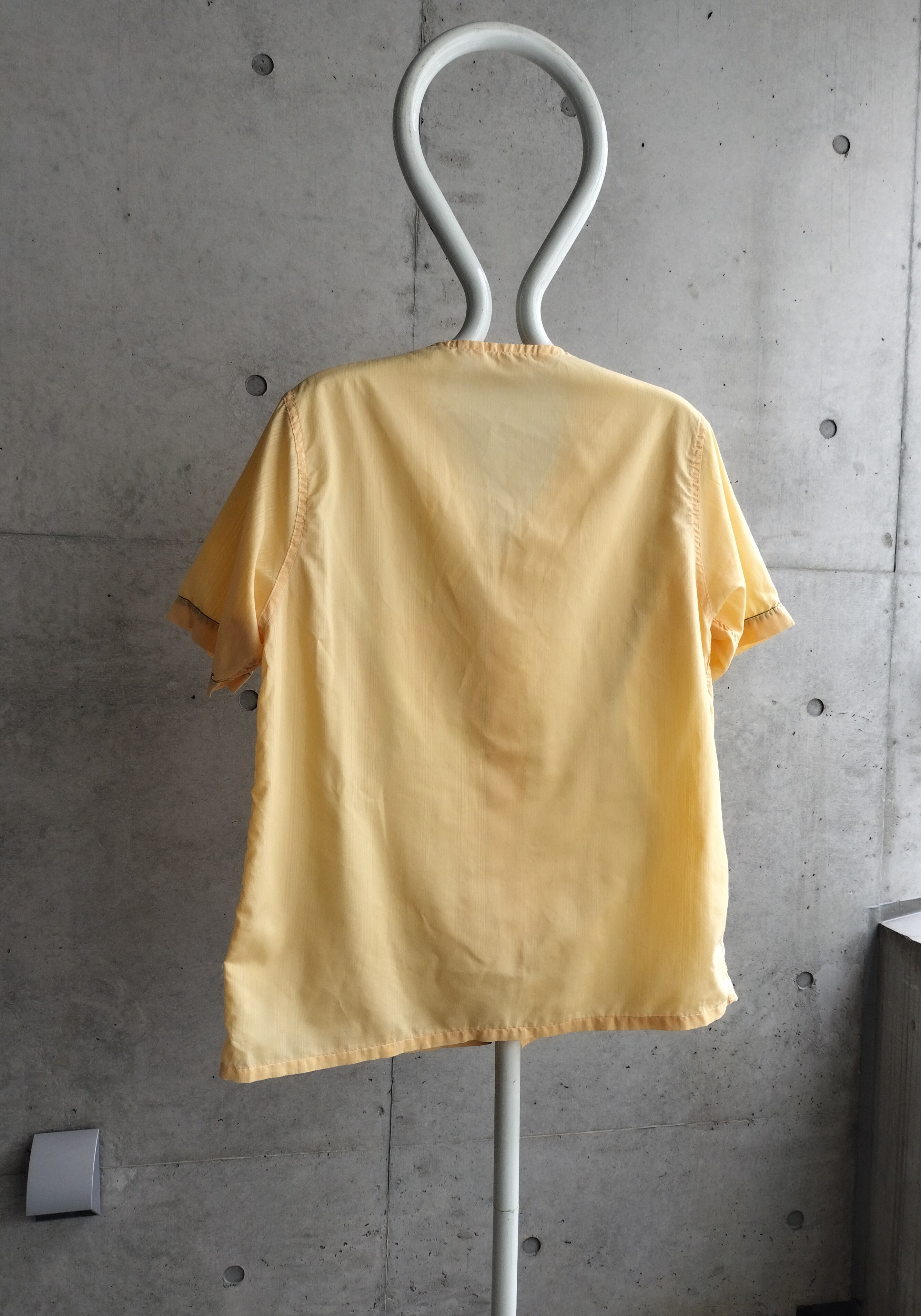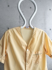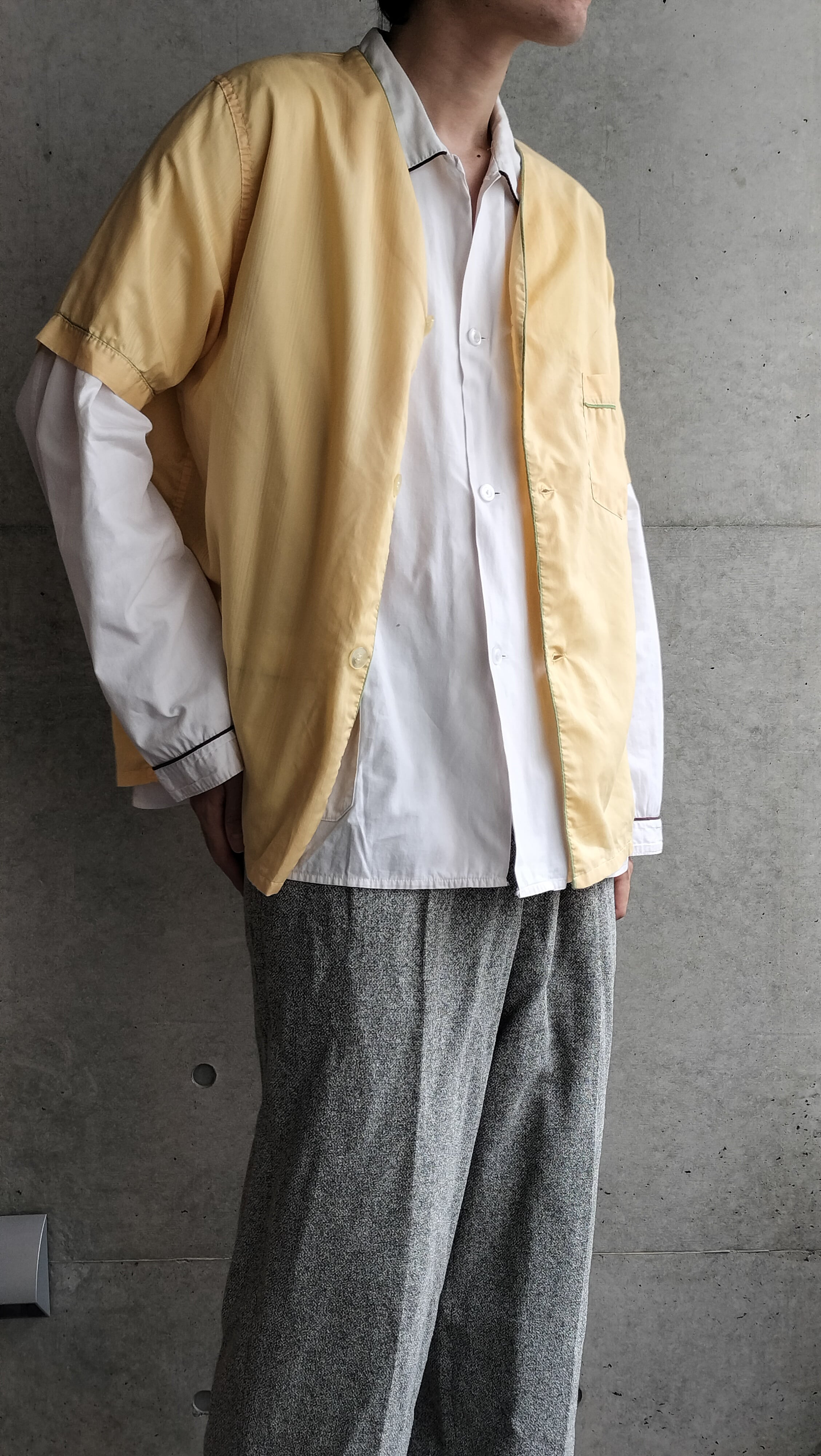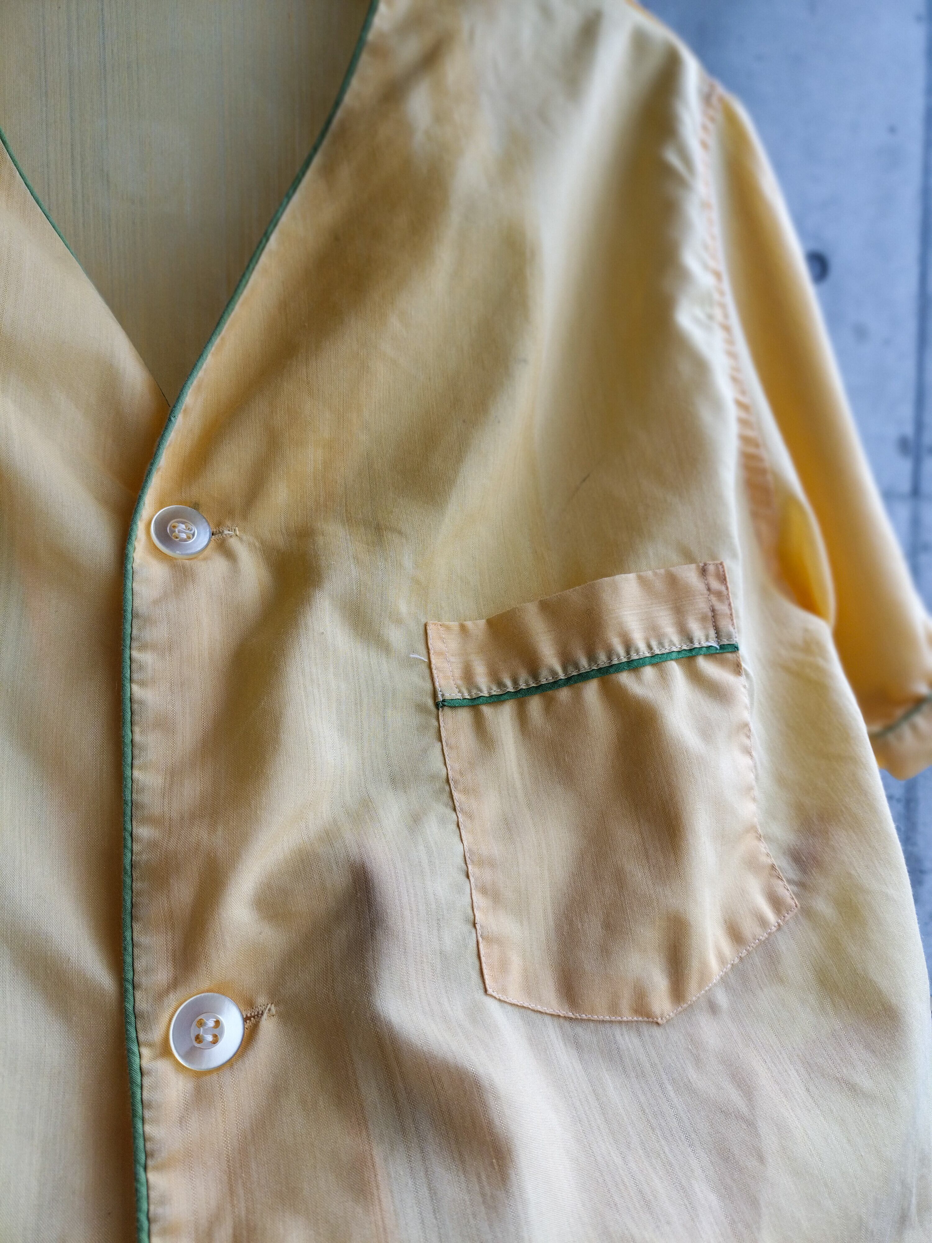 ビタミン色のパジャマシャツ。珍しい半袖でグリーンのパイピング。先日入荷のパジャマシャツとのレイヤードもオススメです。シルエットも極上です。