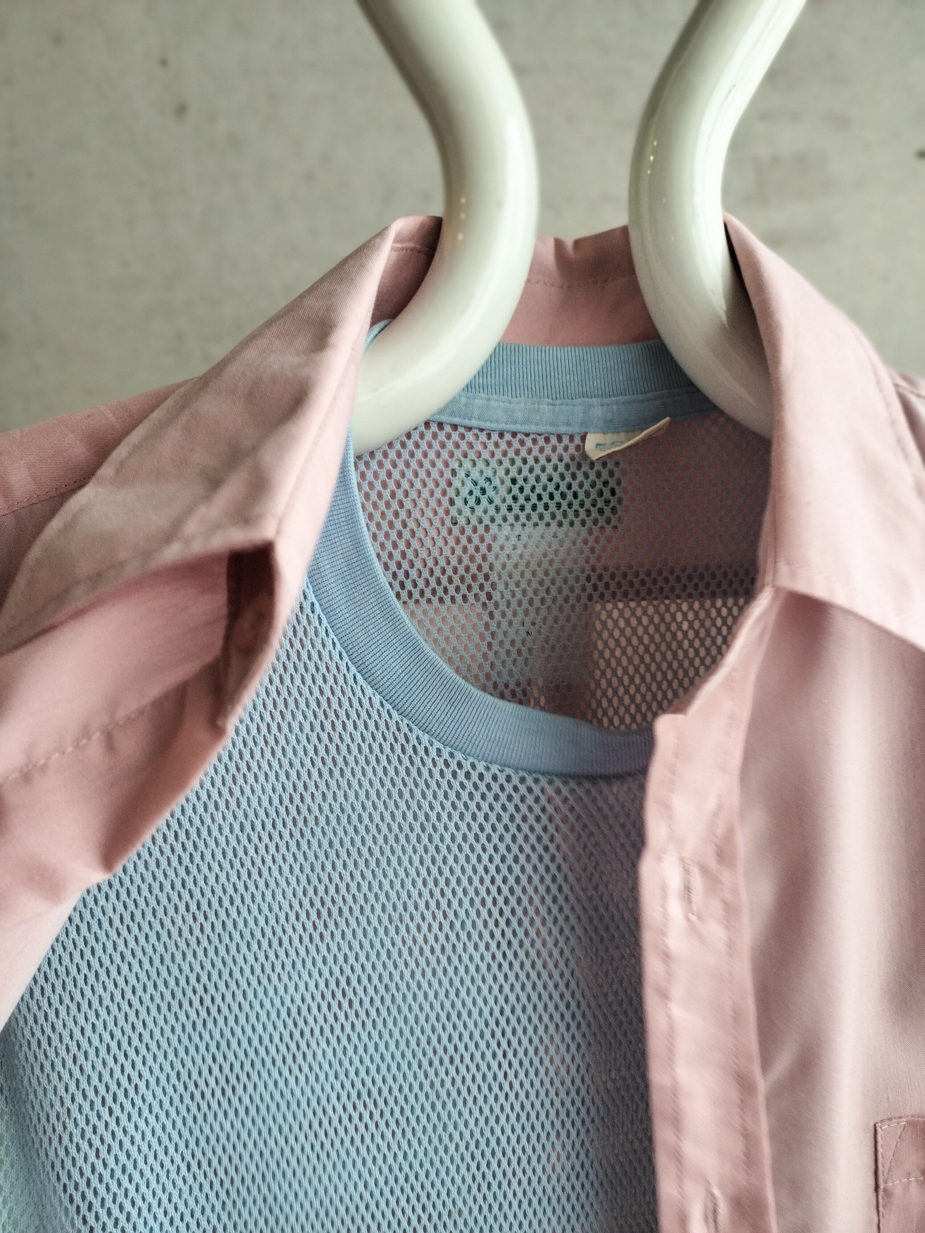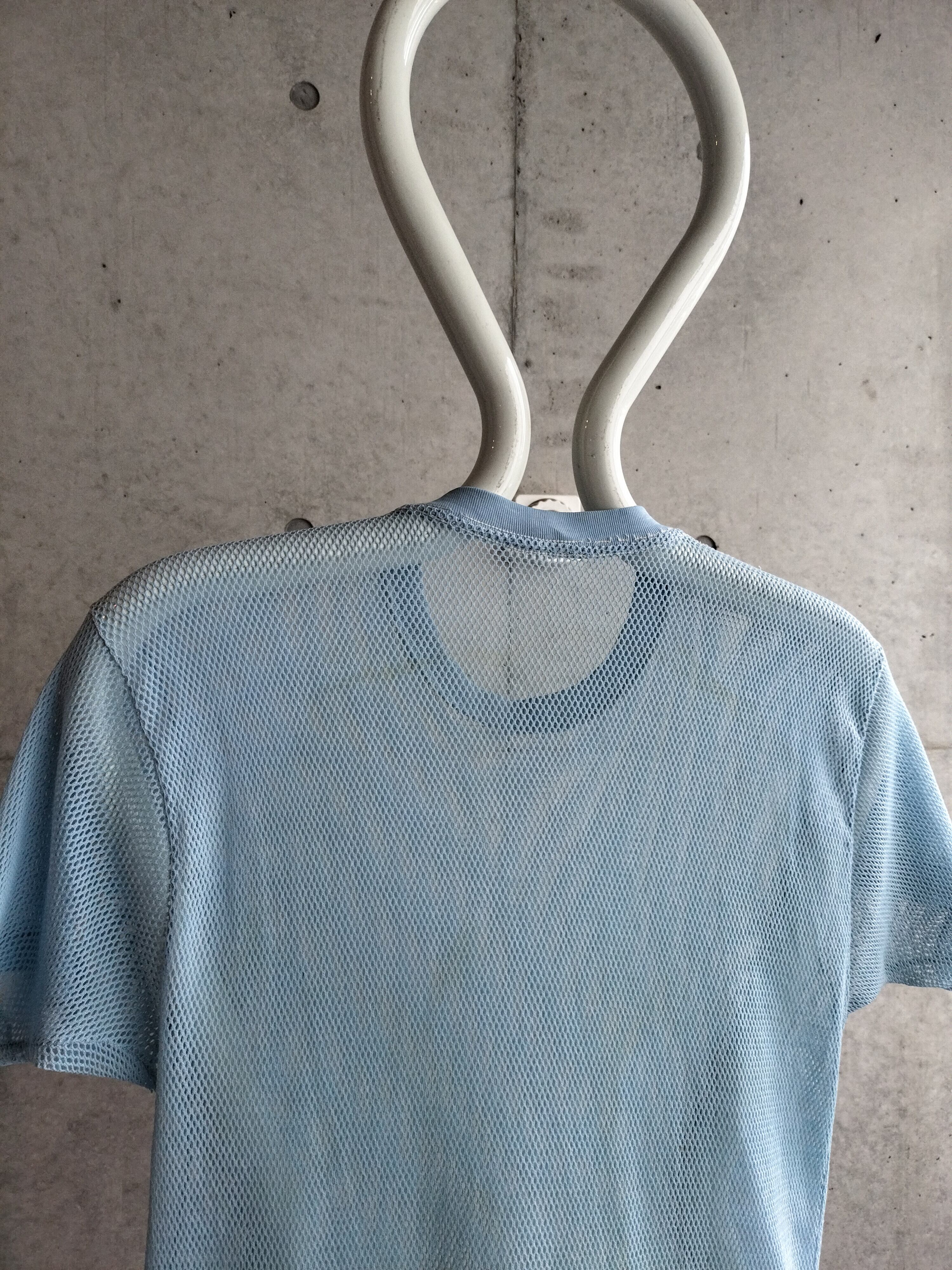 スカイブルー色のメッシュT。単調になりがちな夏場のスタイリングに一石を投じるメッシュTです。USA製。いいサイズのメッシュT探してますが年に2-3着出るかどうかです。