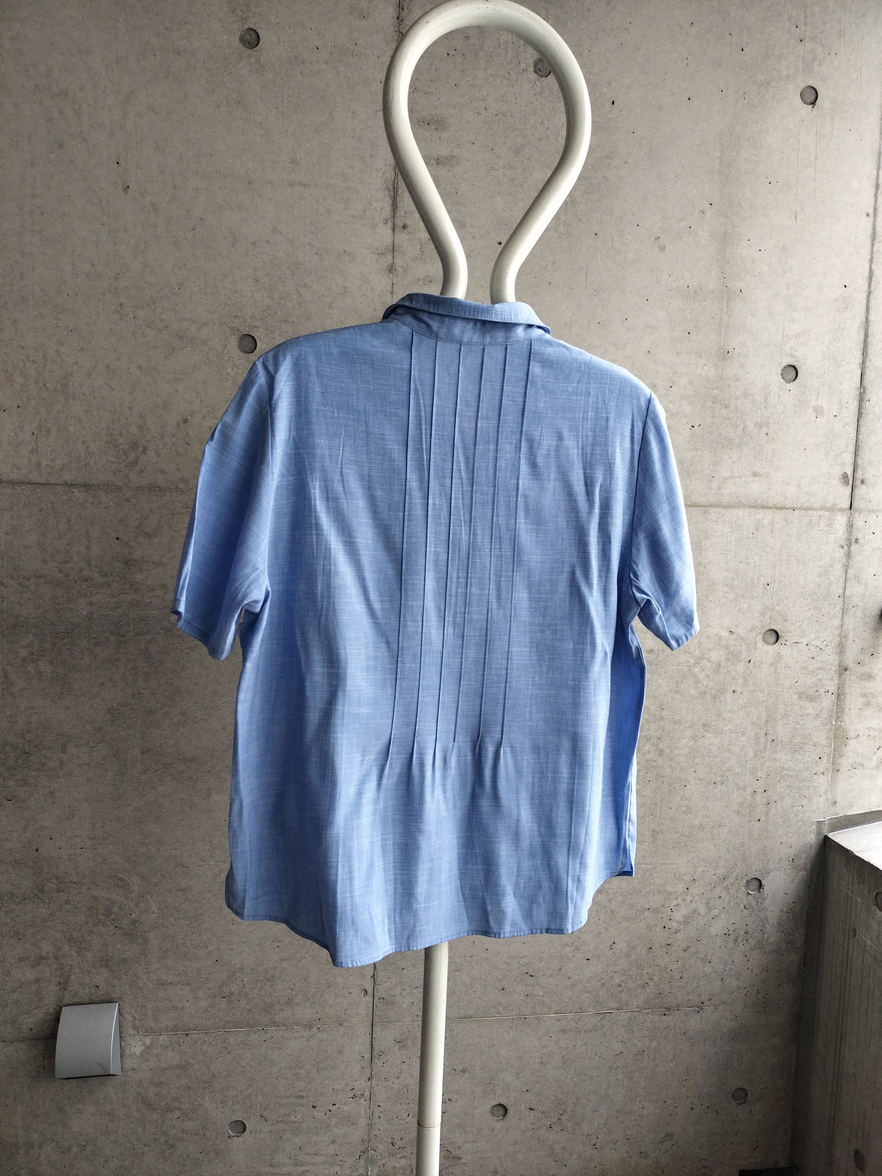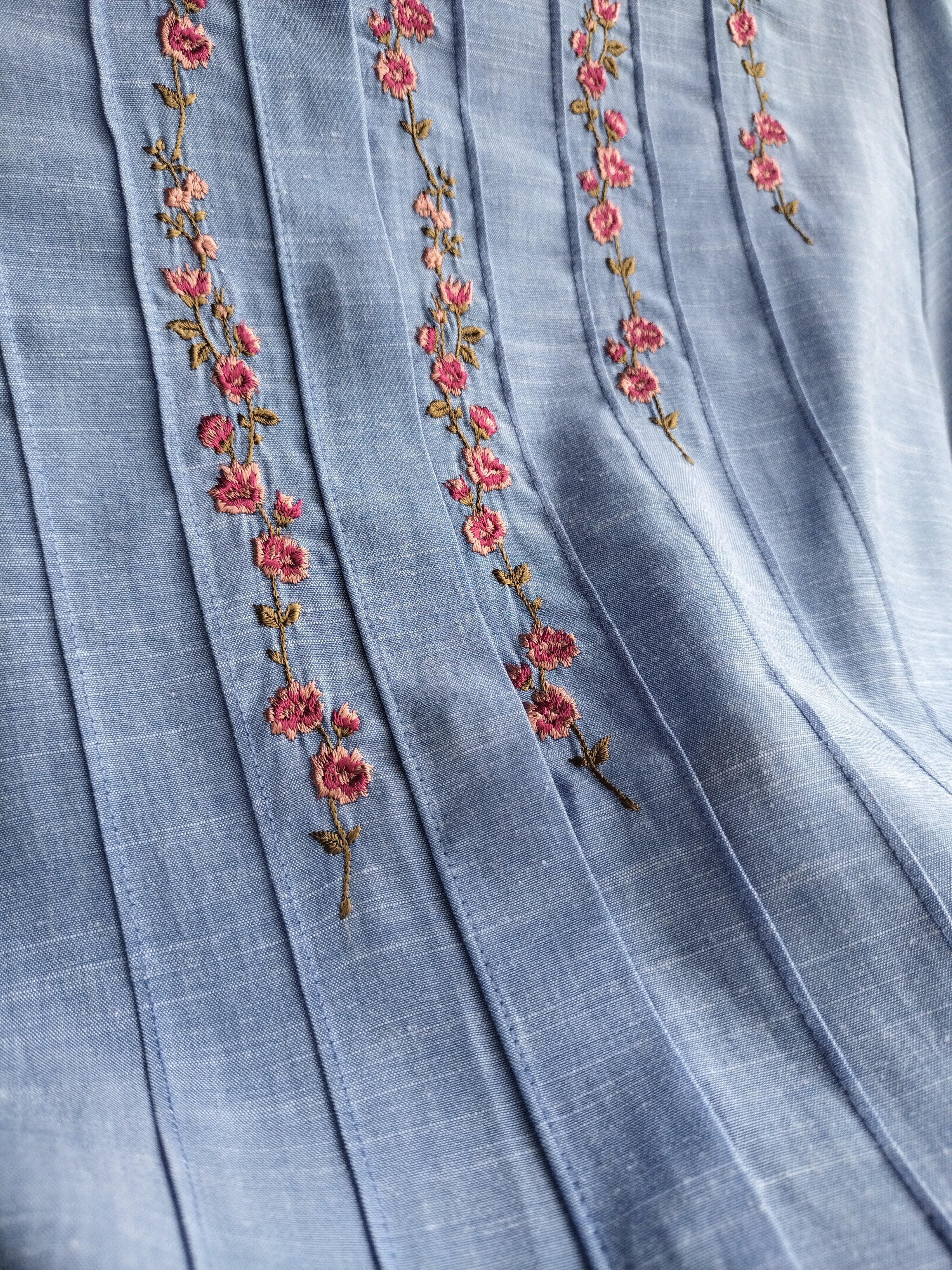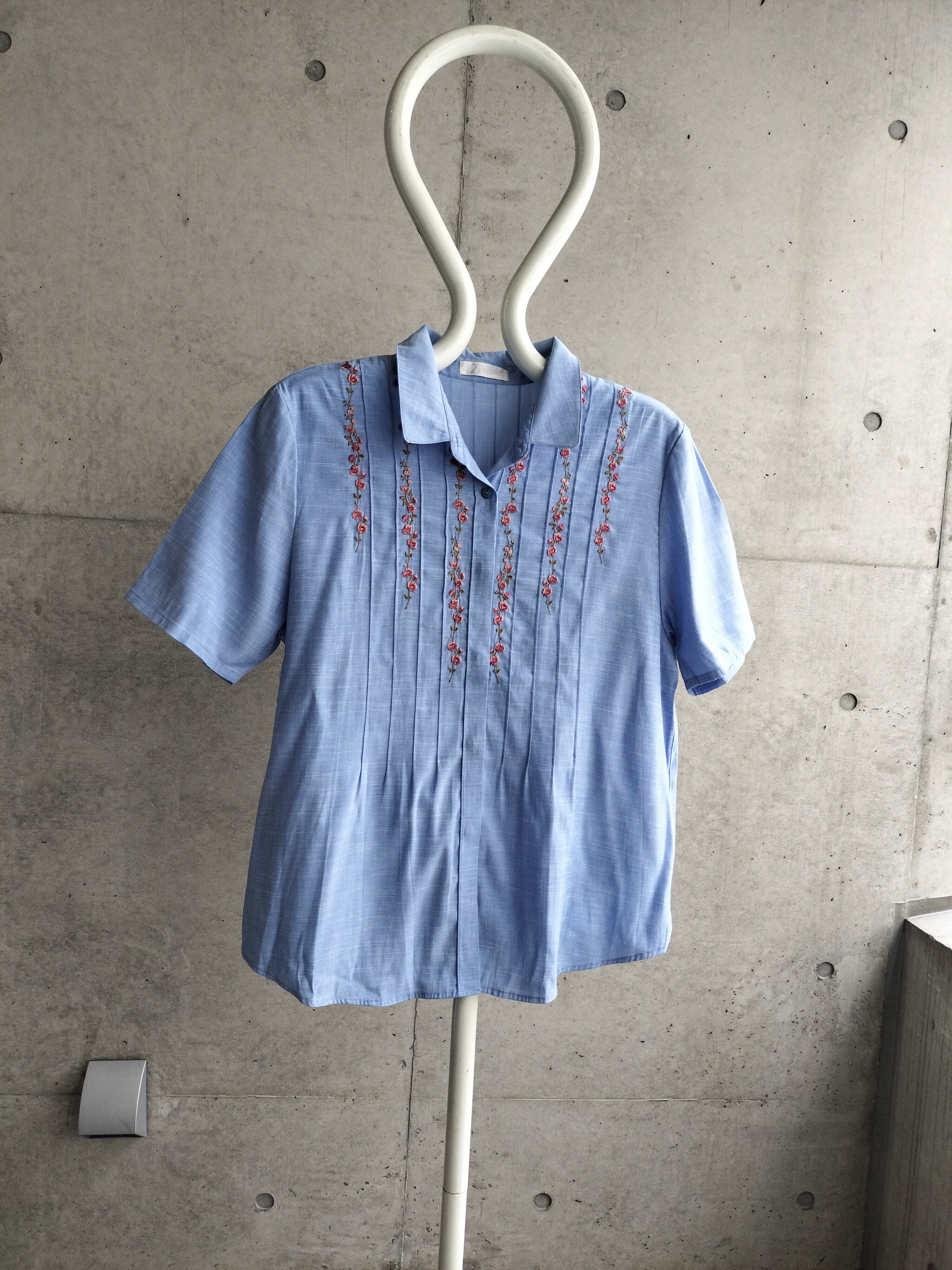 サックスブルー色のシャツ。身頃に花柄刺繍。縦にタックのような切替が入った珍しいパターンです。シルエットも抜群です。メンズに着て欲しい花柄シャツです。