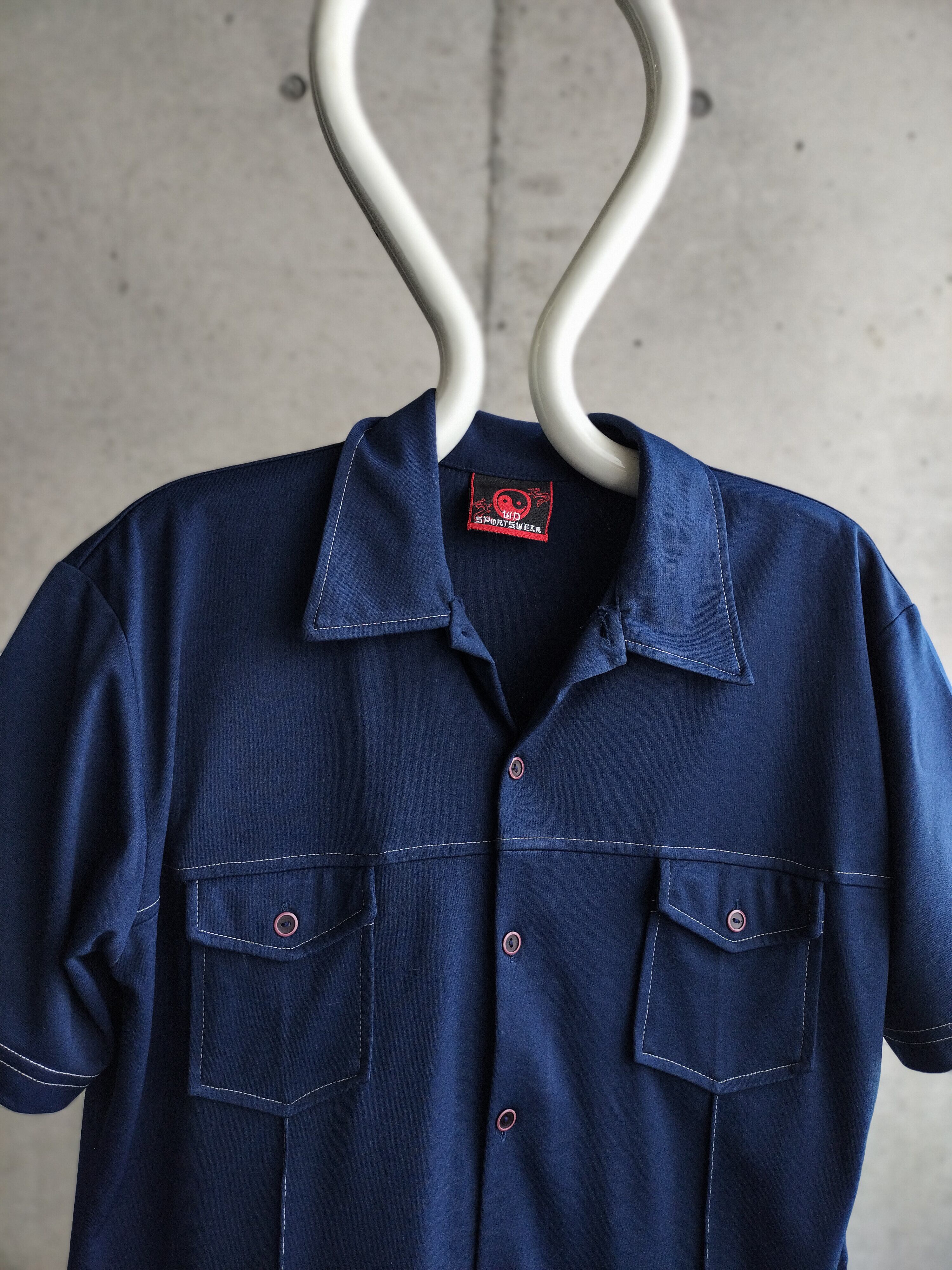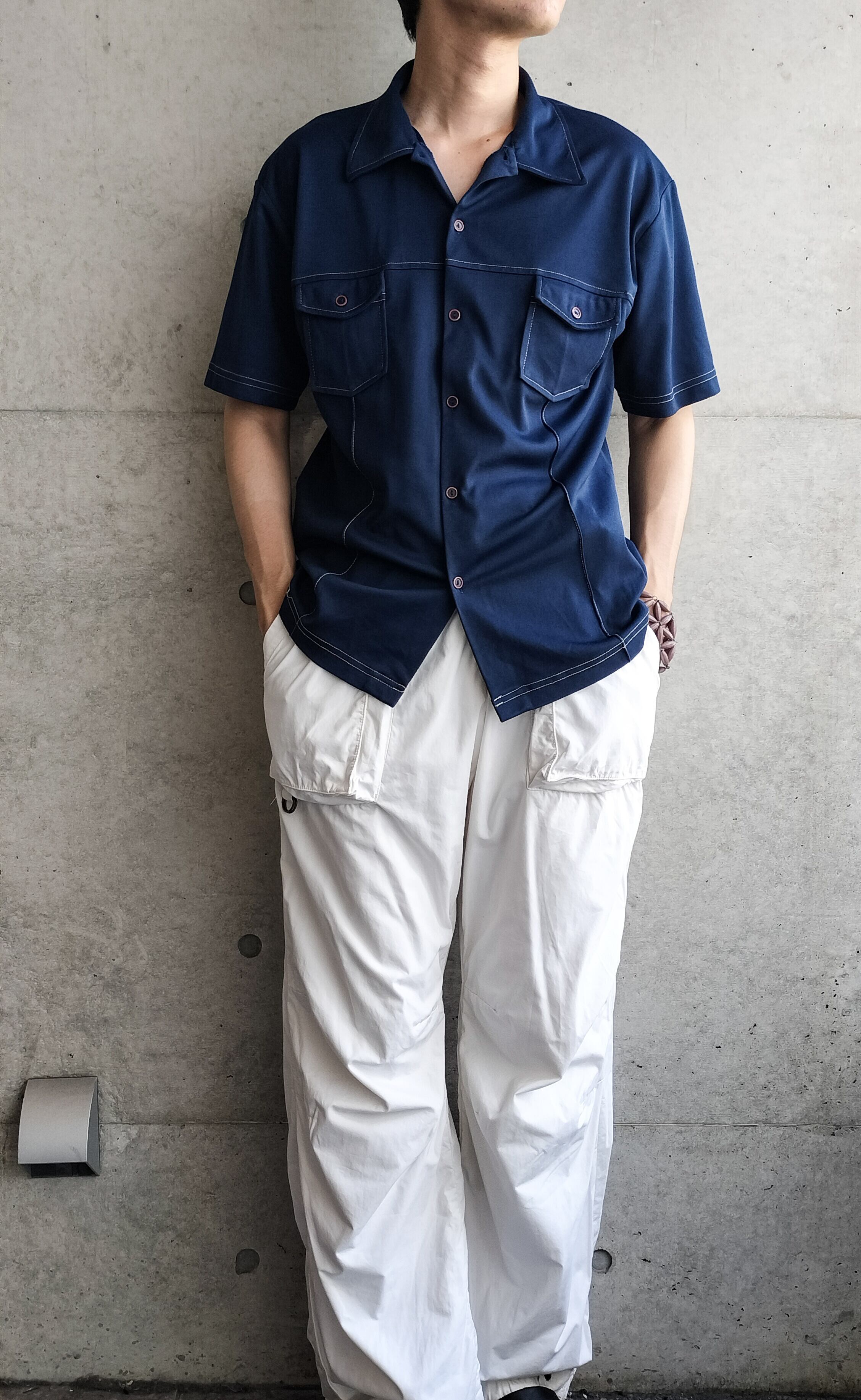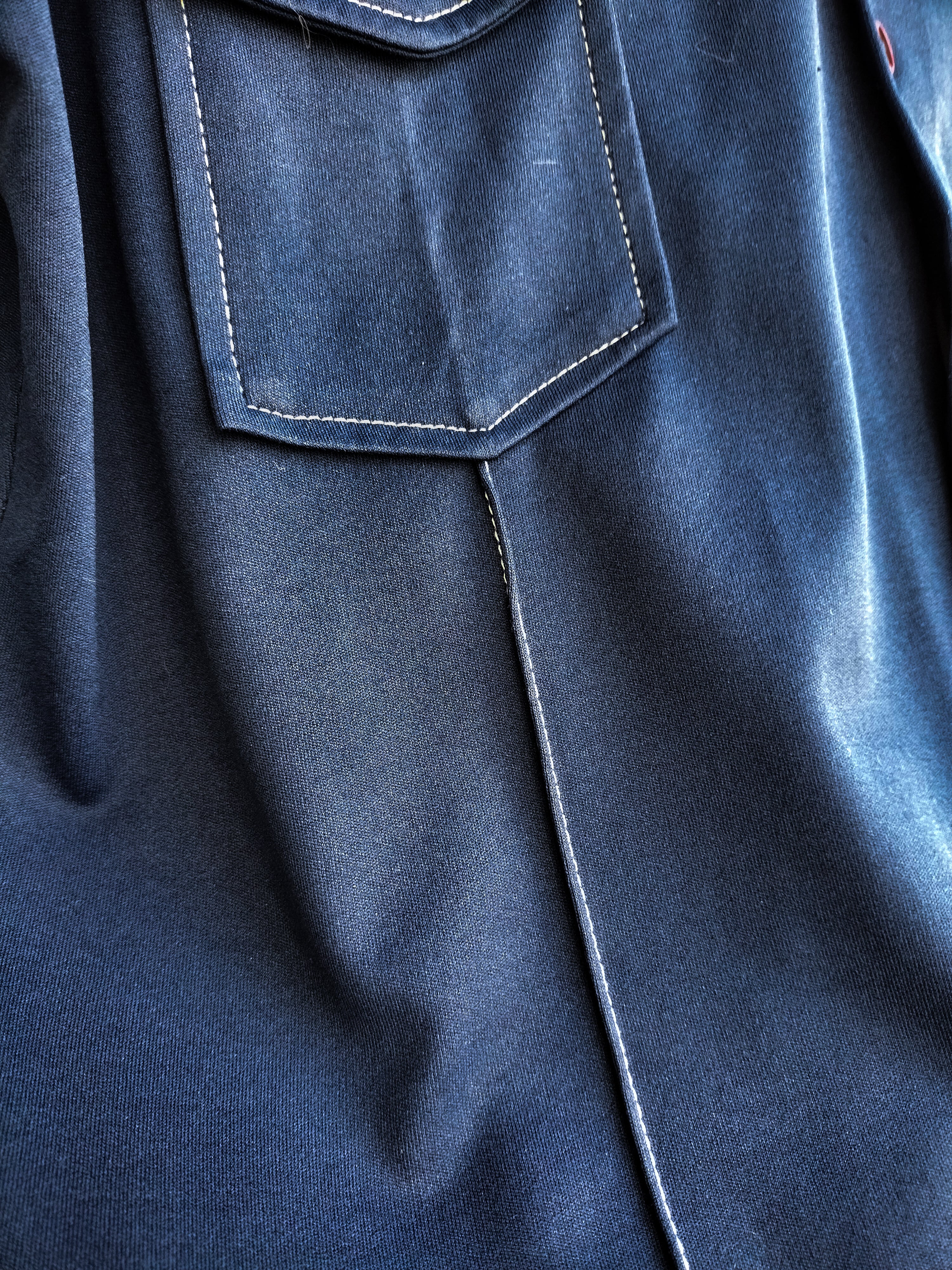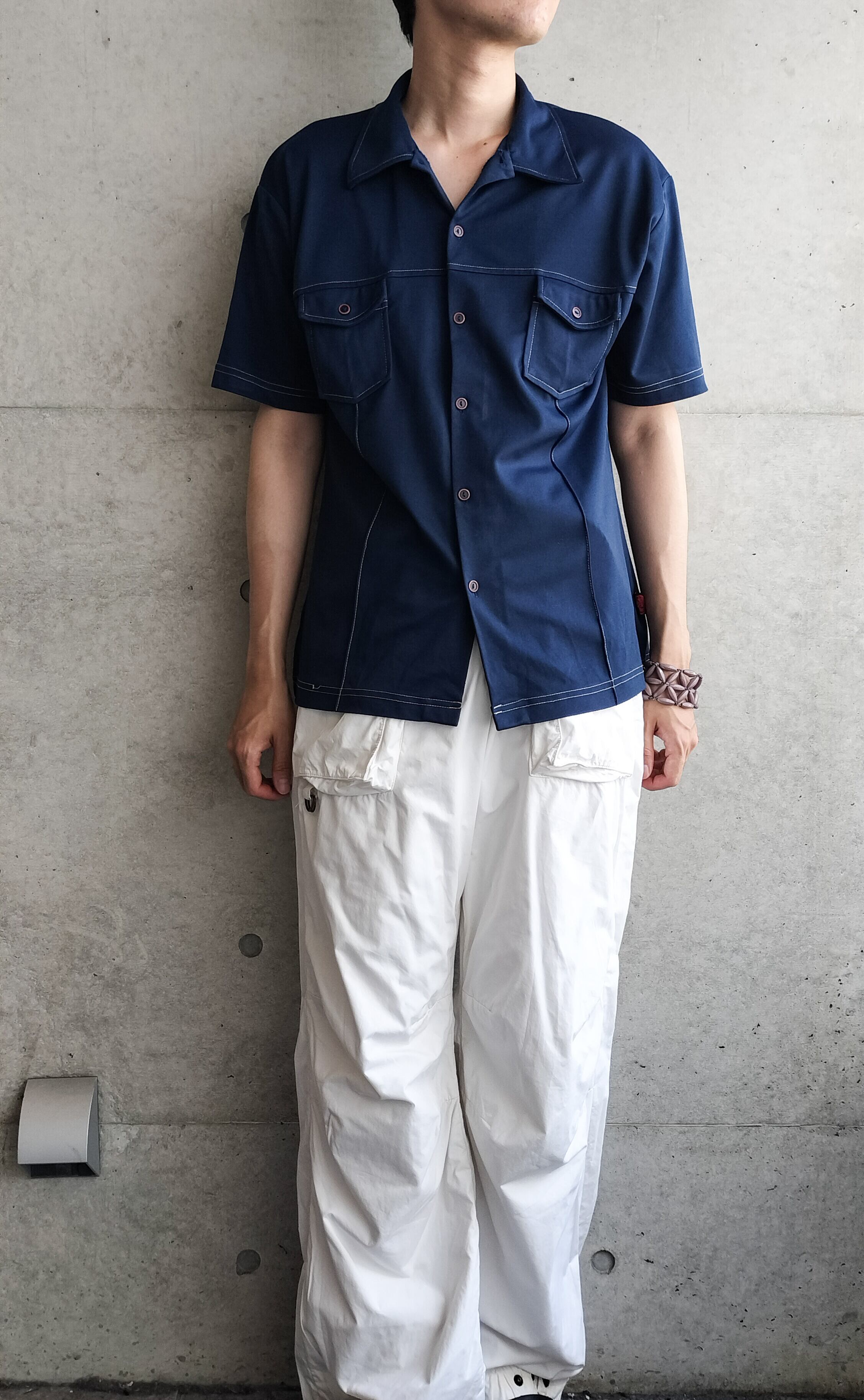 ネイビーに白ステッチが映えるシャツ。身頃にシームが入った珍しいデザインです。シルエットも極上。大人な色気あるシャツです。