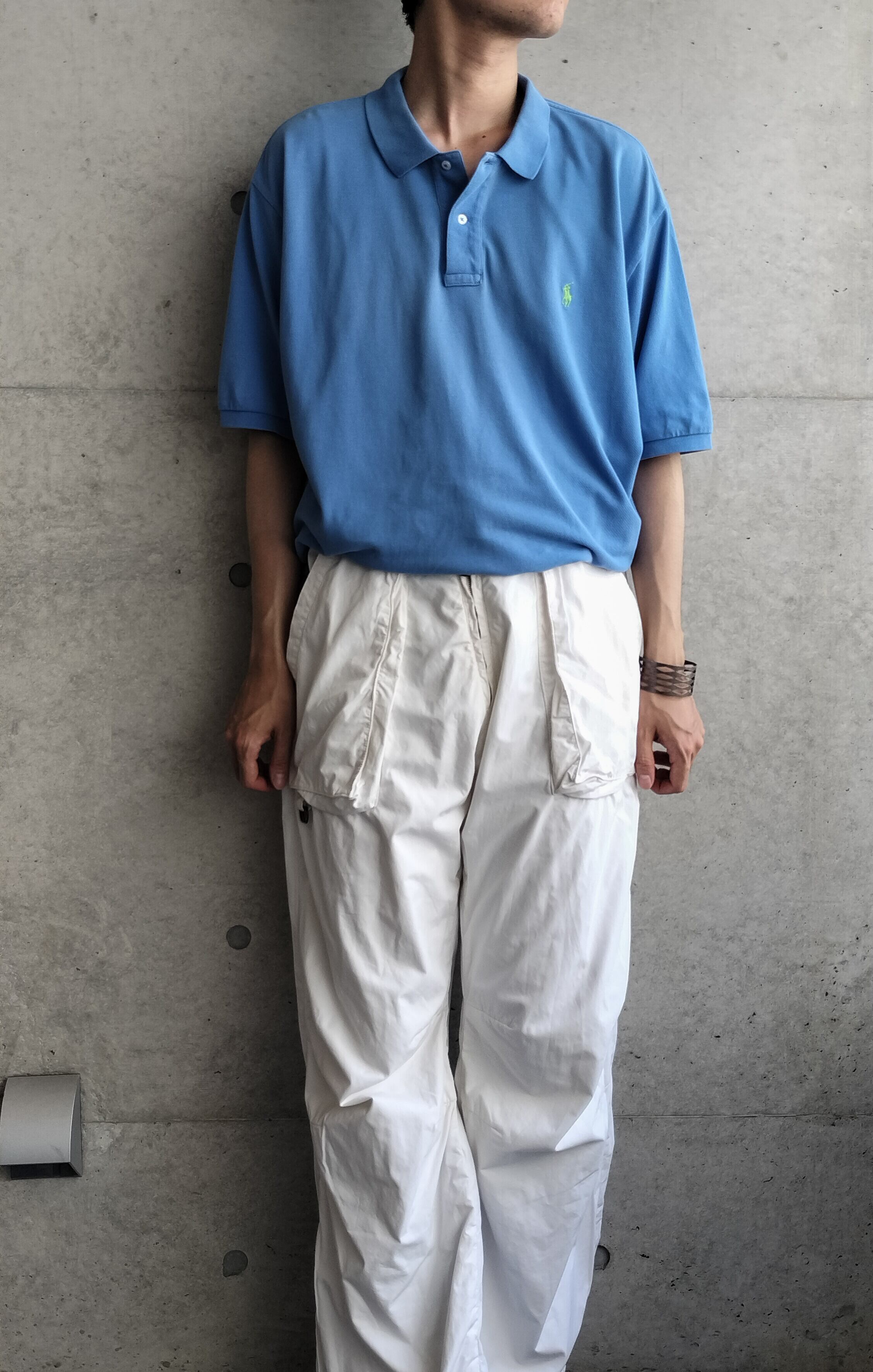 ラルフローレンのポロシャツ。ブルーにライム色のポニーロゴ。探しても案外見ない色味です。身幅が広くてバランスの良いサイズ感。緩くダボッと着れるサイズ感です。