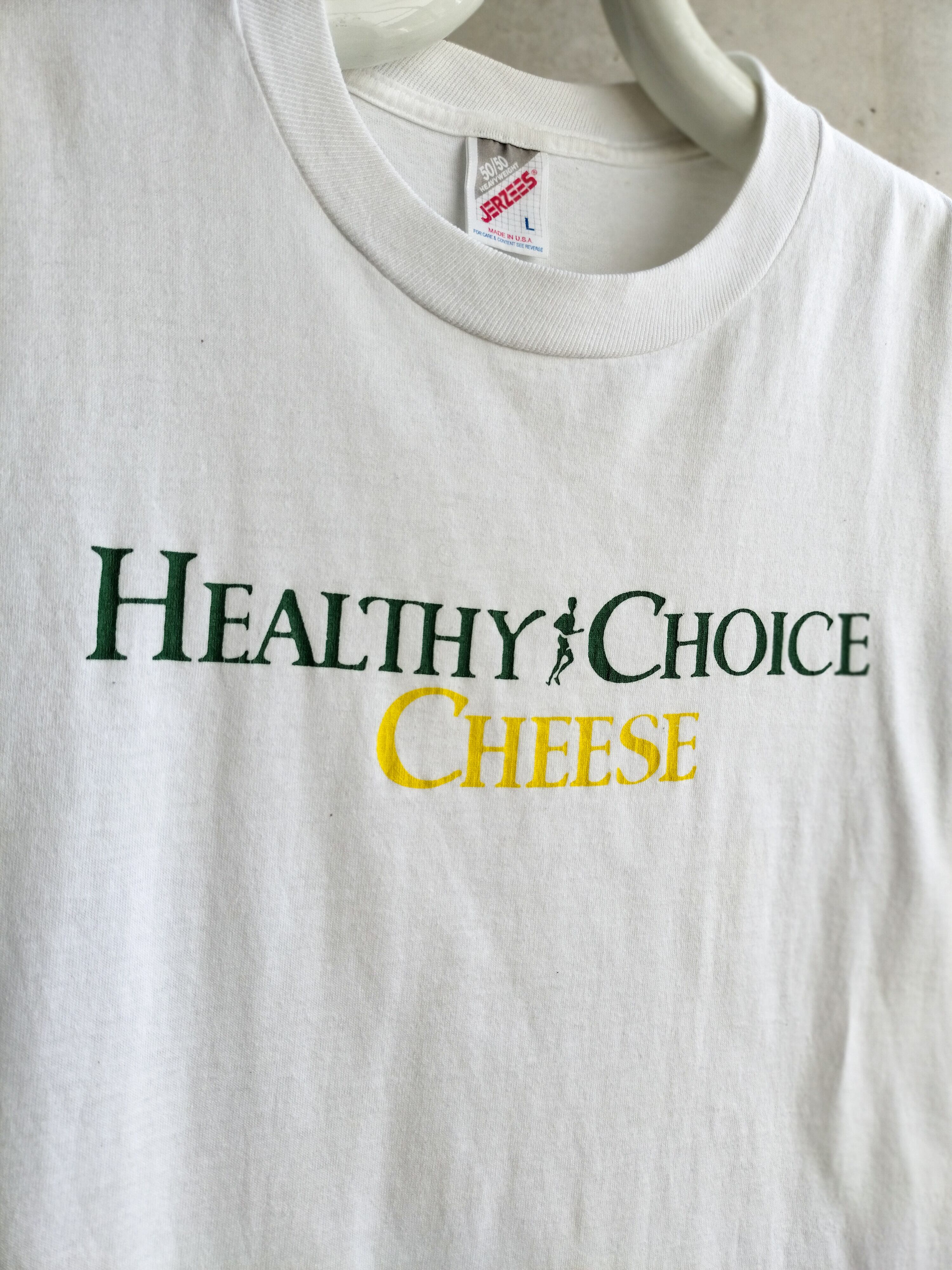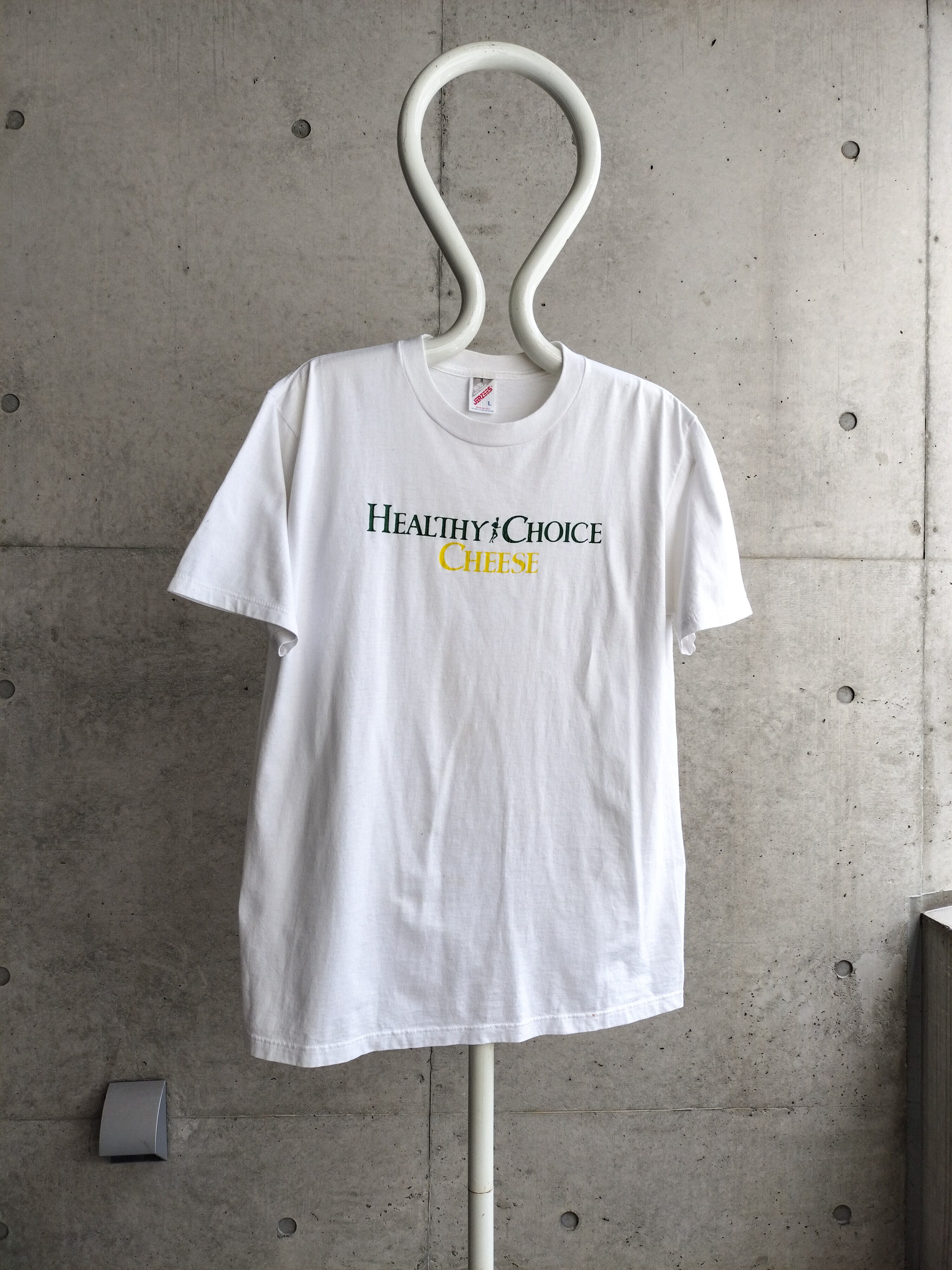 USA製のTシャツ。"HEALTHY CHOICE CHEESE"のロゴ。チーズはヘルシーらしいです。無類のチーズ好きな方は是非。