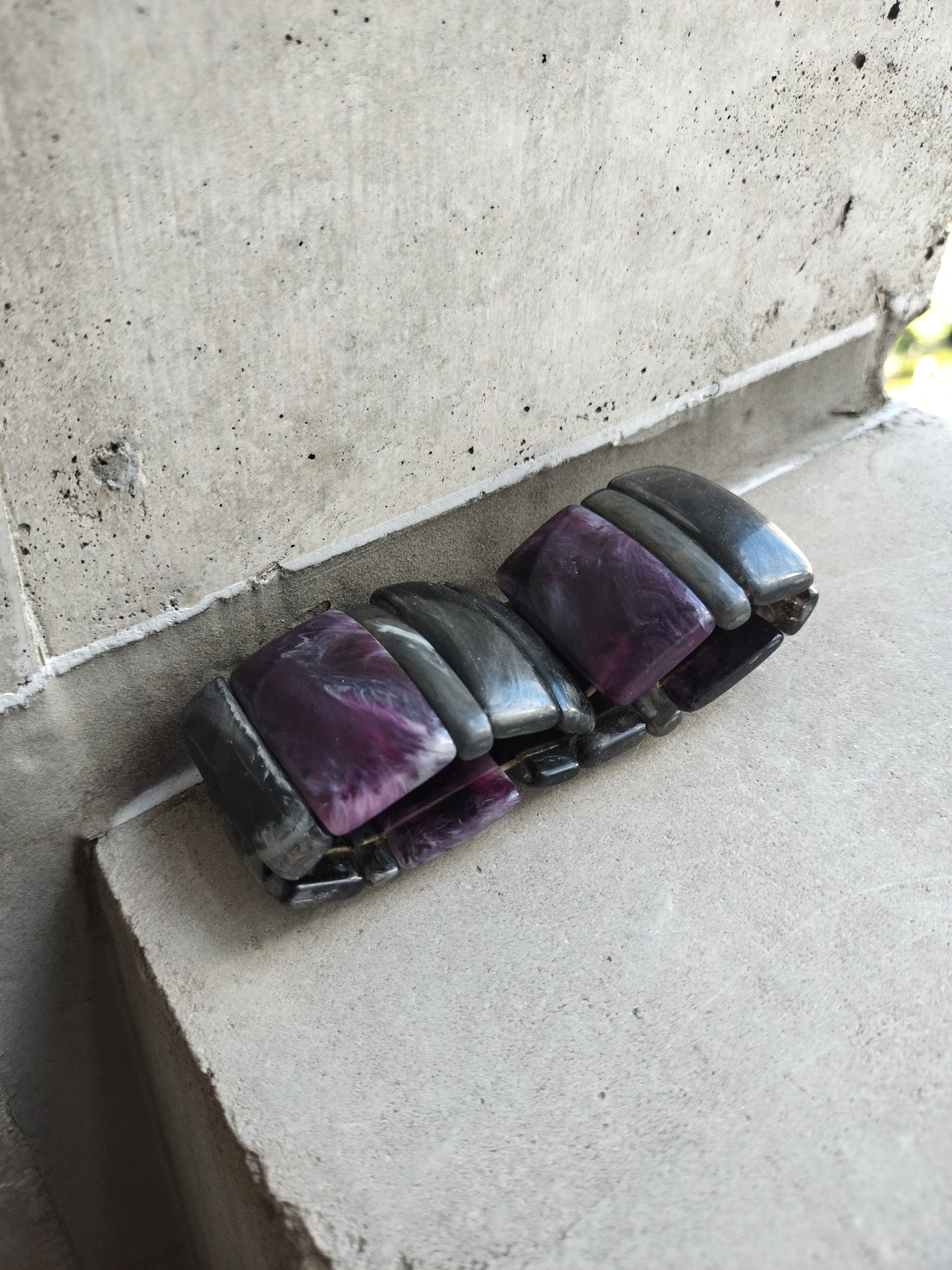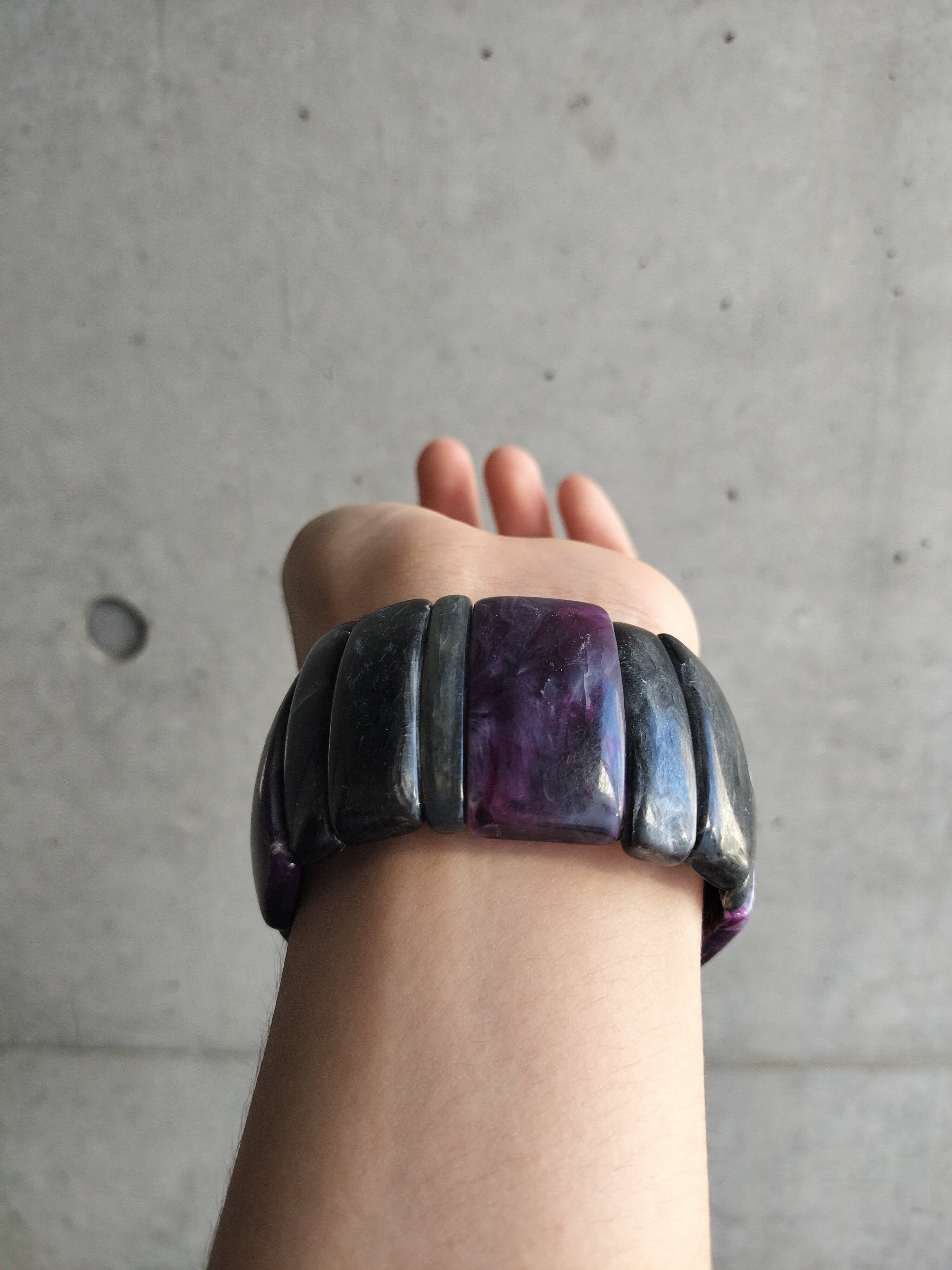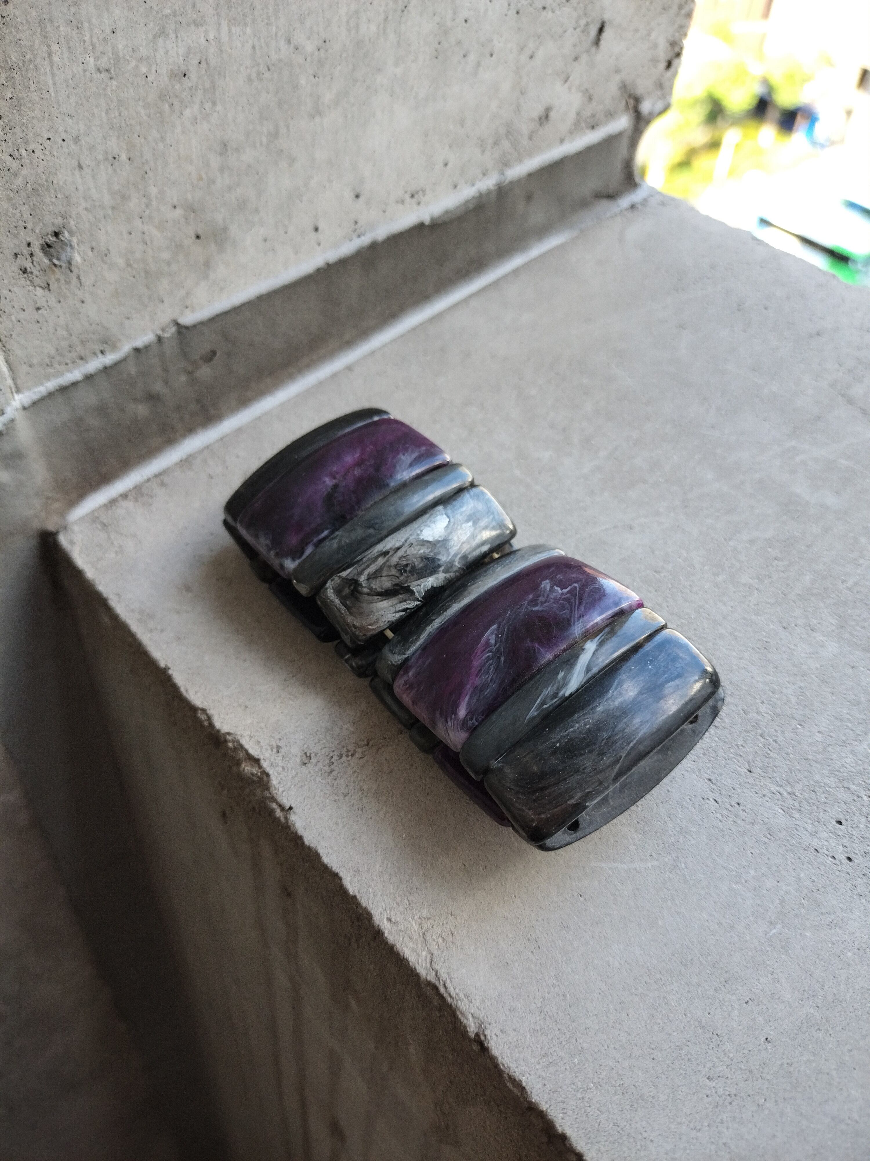 ブラックとパープルのマーブルブレスレット。シンプルにデザインと配色がいいです。黒系ベースなのでどんな服装とも合わせやすいです。
