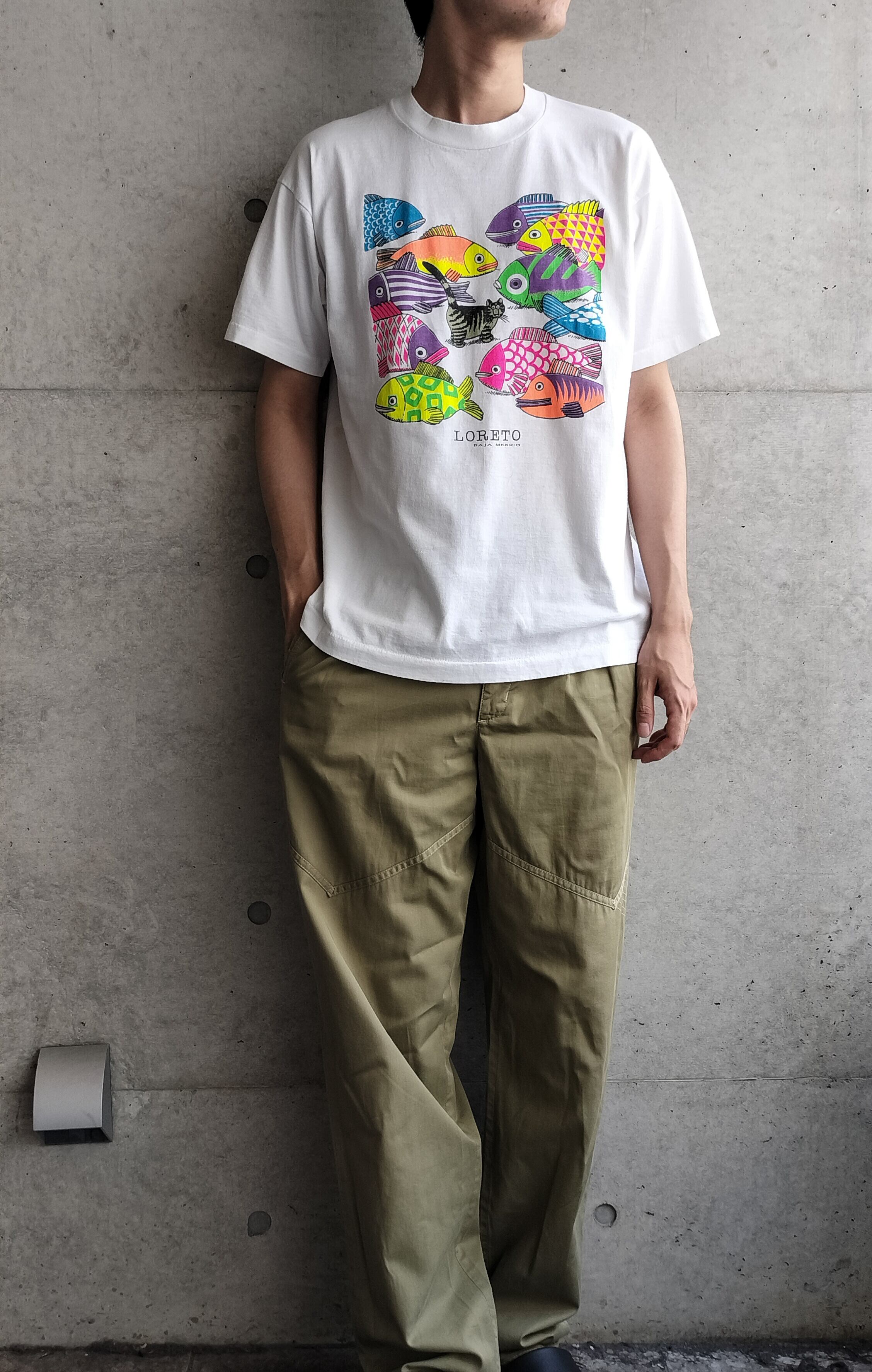 クリバンキャットのTシャツ。中でも珍しい魚で囲まれたデザイン。こんだけカラフルでレインボーカラーなのも希少です。魚を食べる立場が、逆転された面白いデザインです。