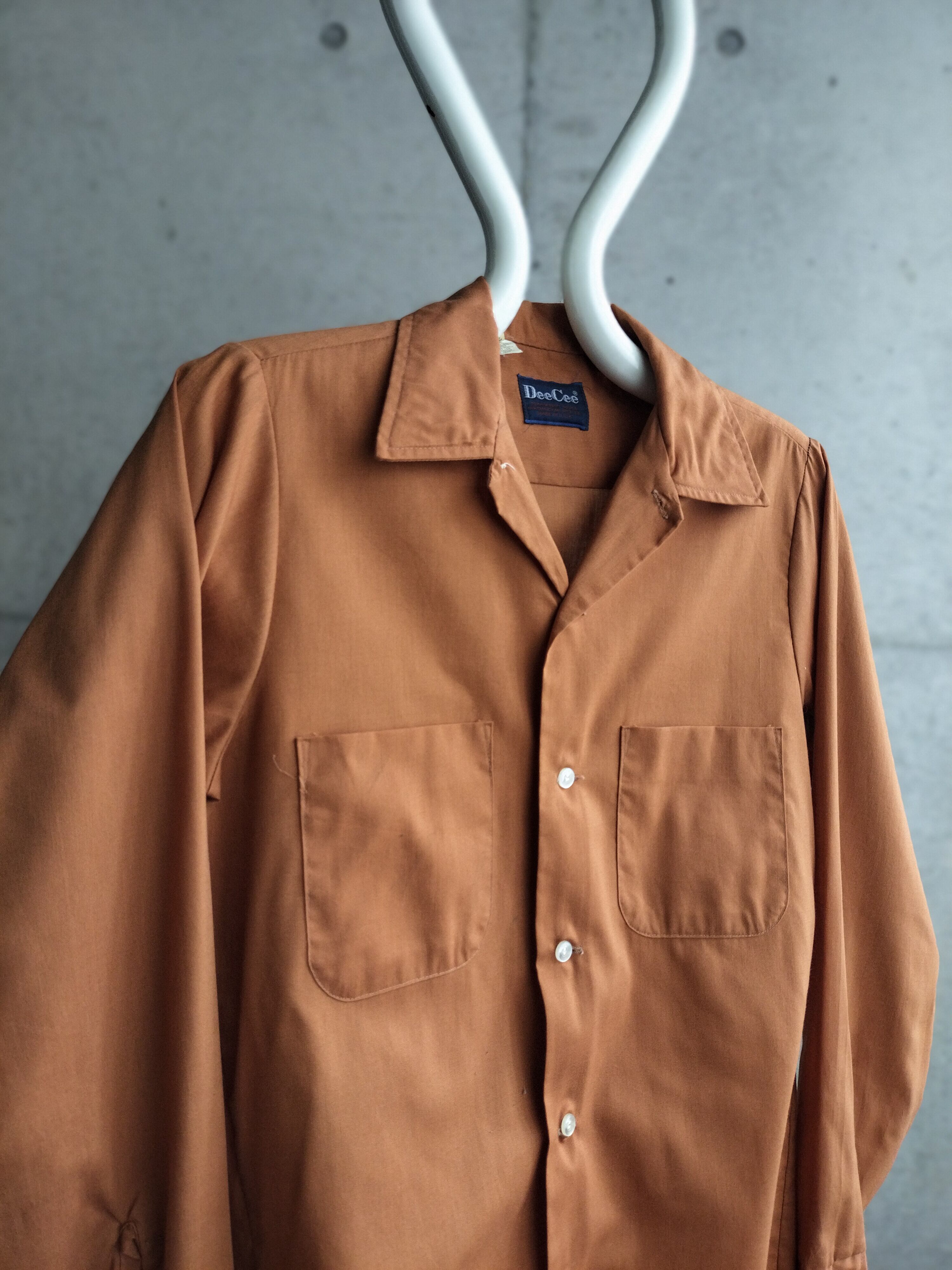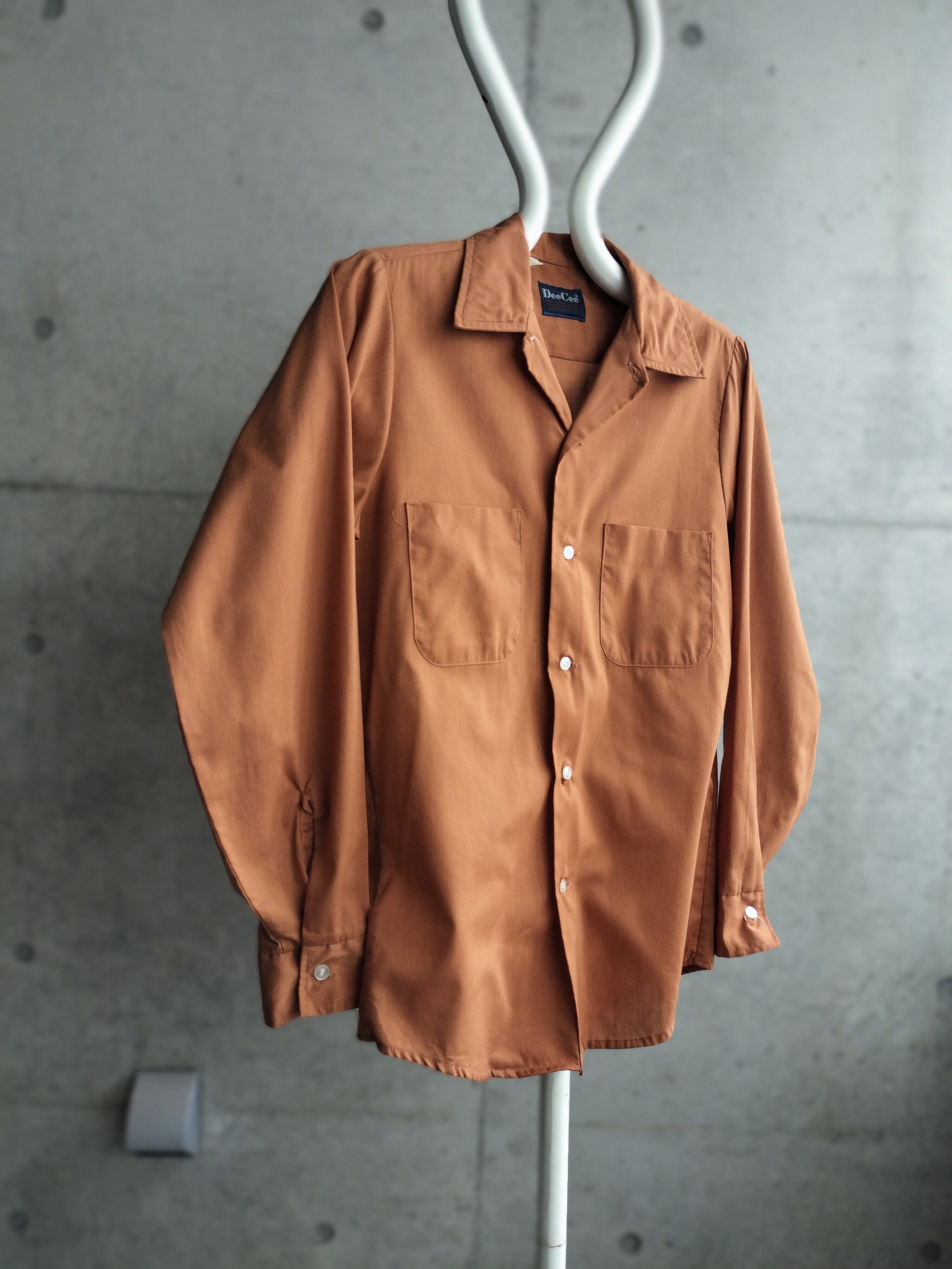秋物入荷。USA製DEE CEEの開襟シャツ。タグもいいの付いてます。秋らしいブラウンカラー。ボタンはクリアボタンです。小柄なメンズ、レディース向けサイズです。