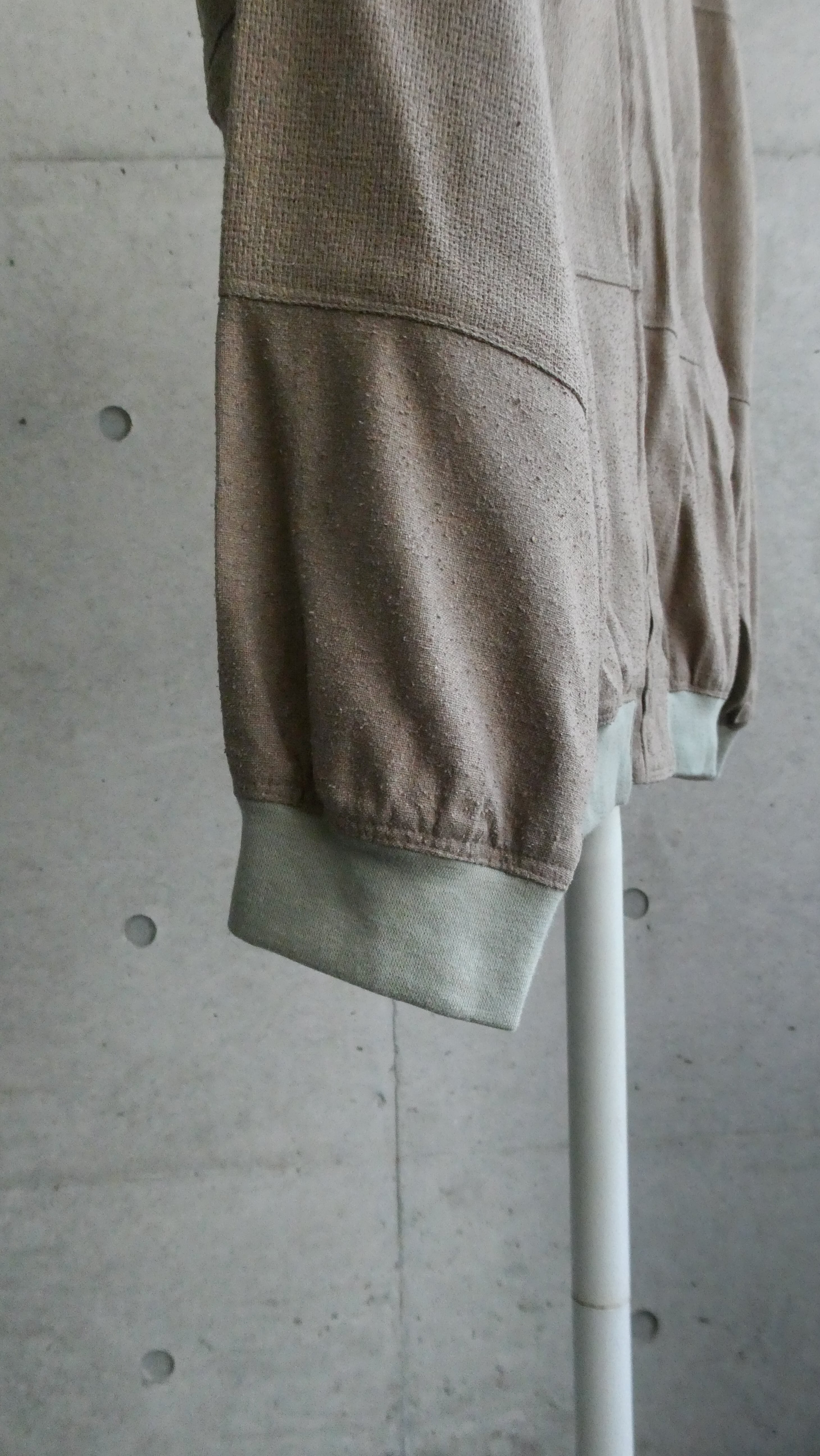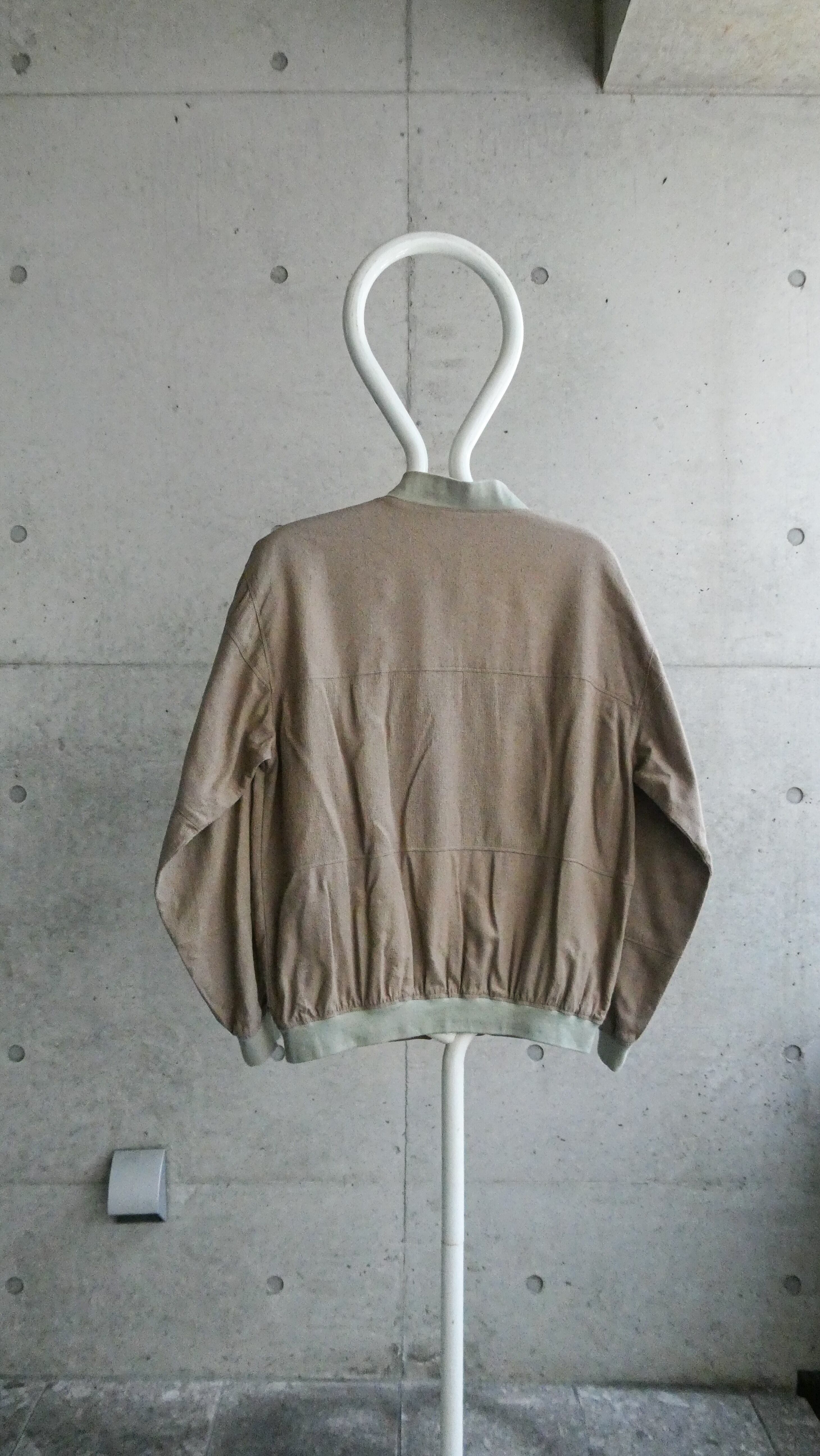 ミルクティーカラーのシルクネップ生地。シルク100でガサガサした面白い生地。袖、襟はカーキのリブ。配色が凄くいいです。さらっと羽織れる、いい古着です。