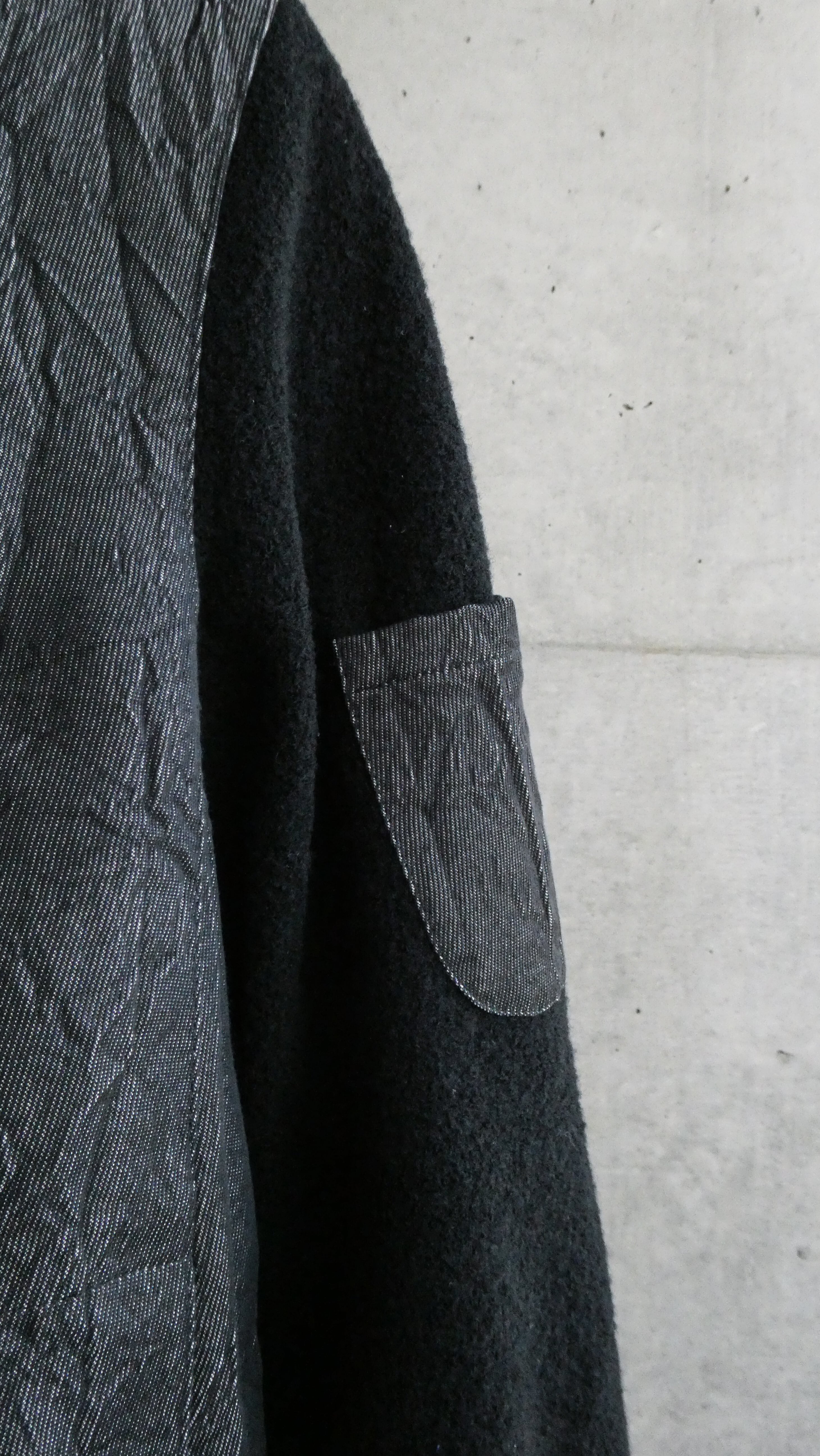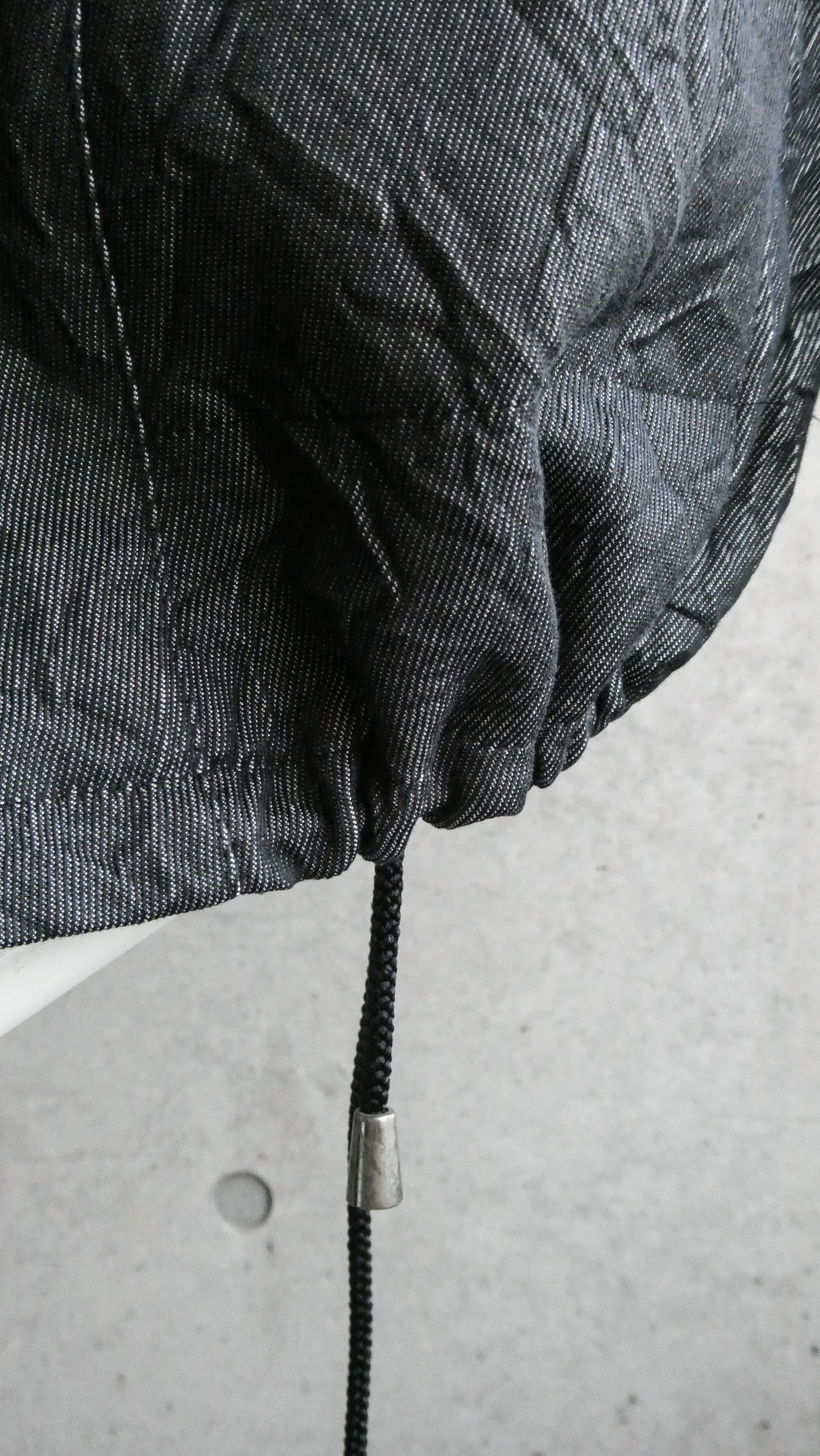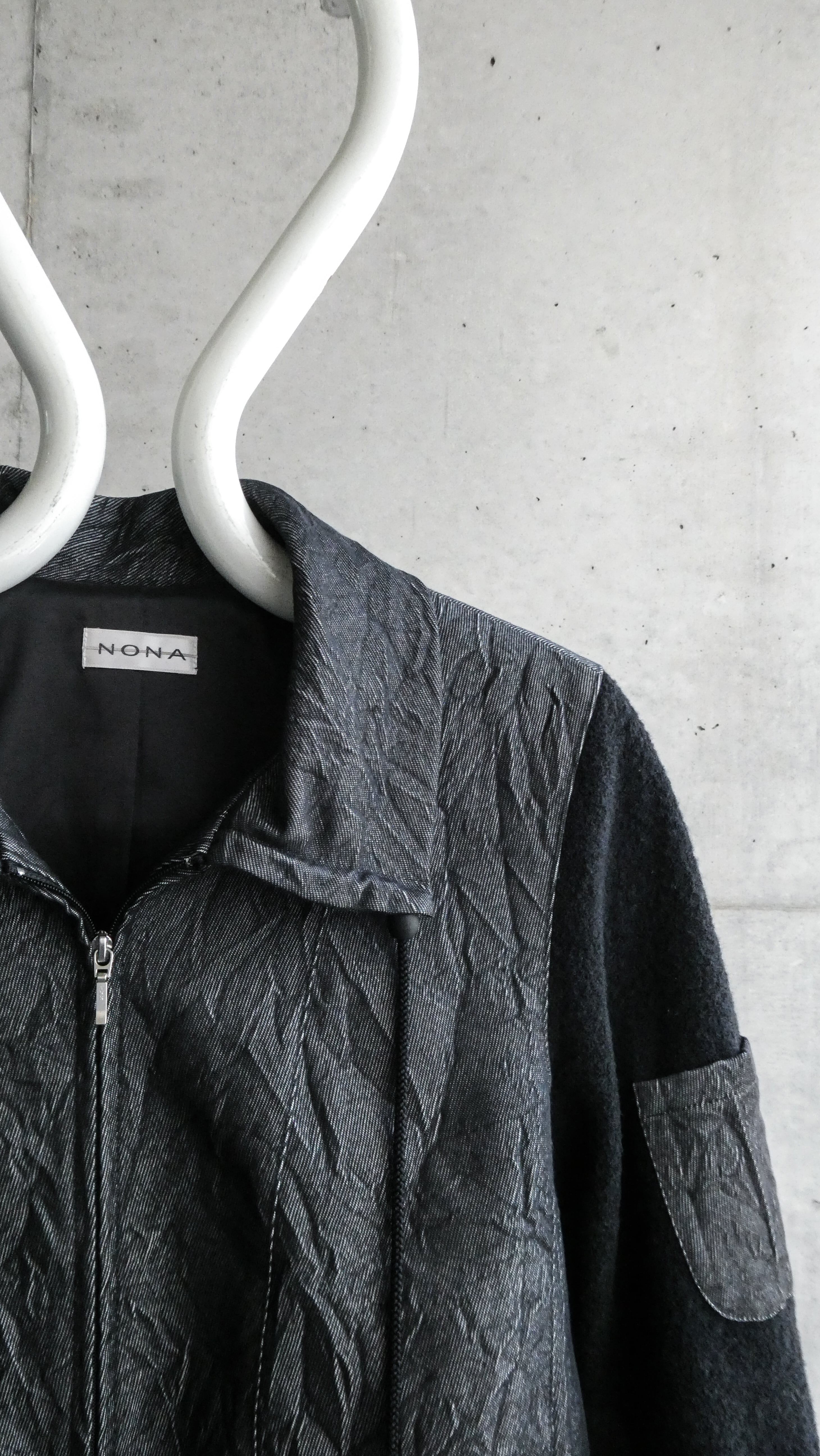シワ加工のシュリンクデニムとウールの切替パターンのブルゾン。シュリンク加工されたデニム生地なのもいいです。裾にドローコード付き。小柄なメンズ、レディースサイズ向けです。