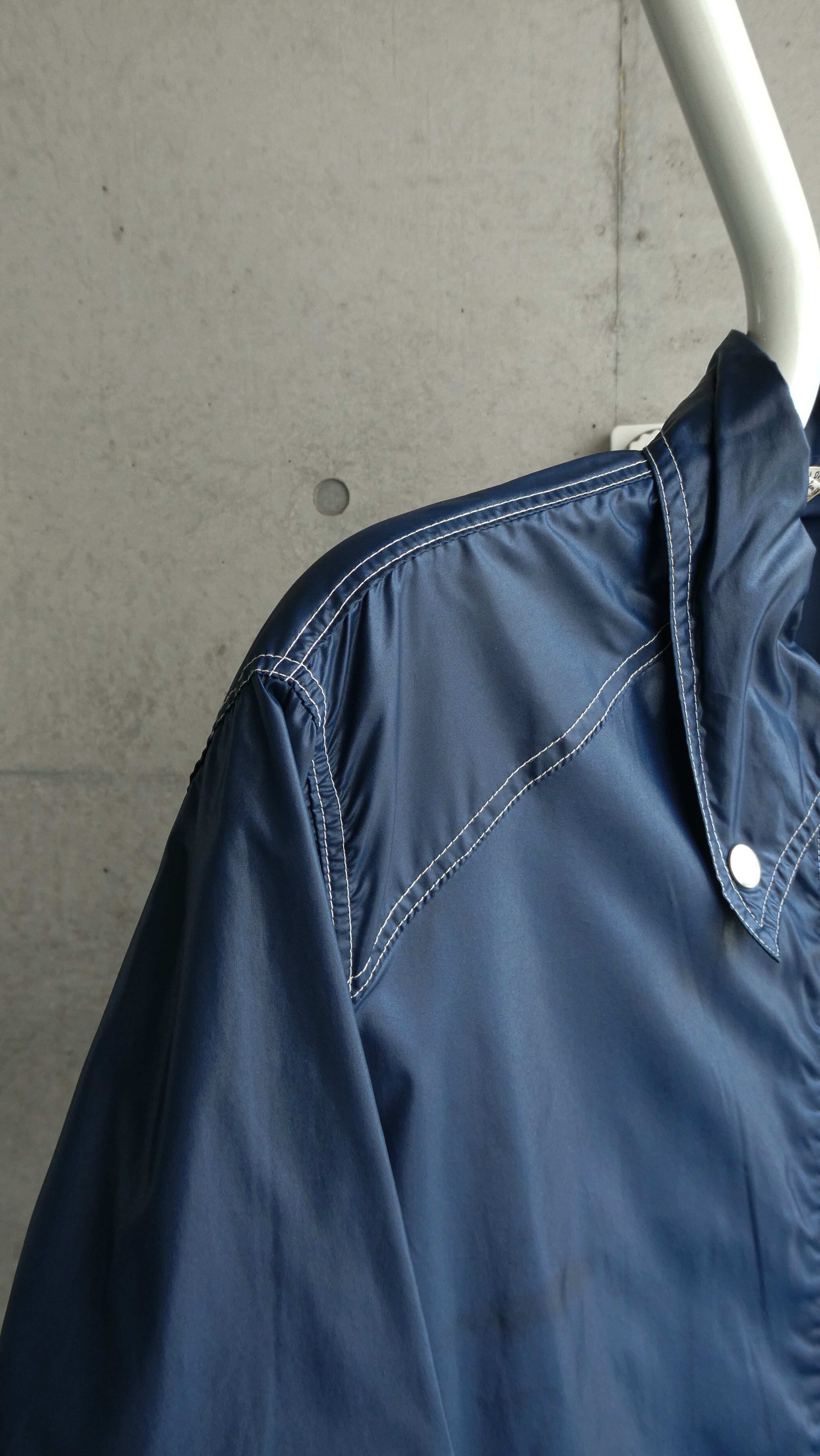 80s頃のネイビーナイロンブルゾン。独特なヌメリのある光沢です。ネイビーに白ステッチ。凄く今季気分なコンパクトなサイズ感です。シルバーのボタンも凄く映えてます。