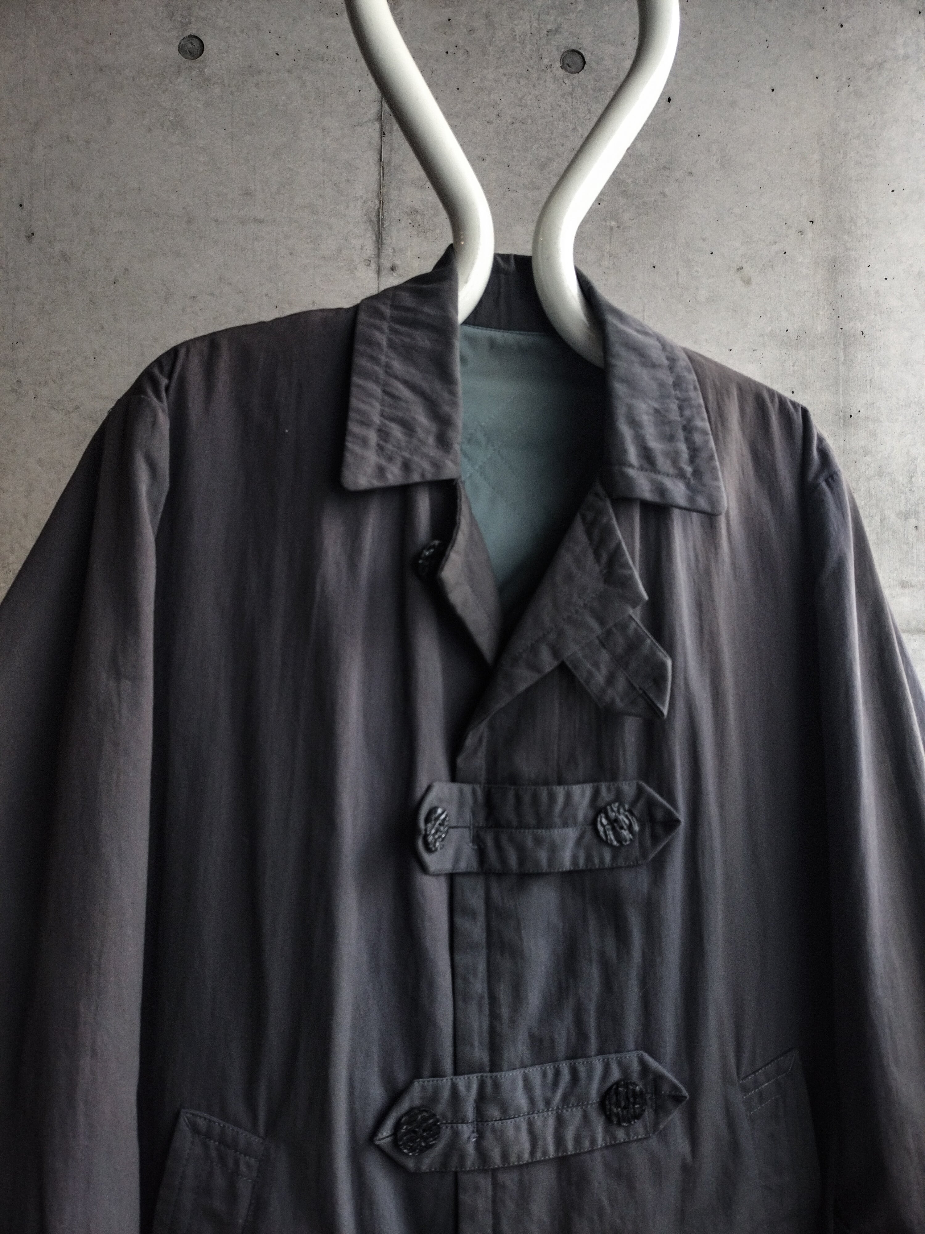 チャコールカラーの変わり種コート。ダッフルっぽい作りのデザイン。開けても閉めても凄くいいです。唯一無二なデザインのコートです。