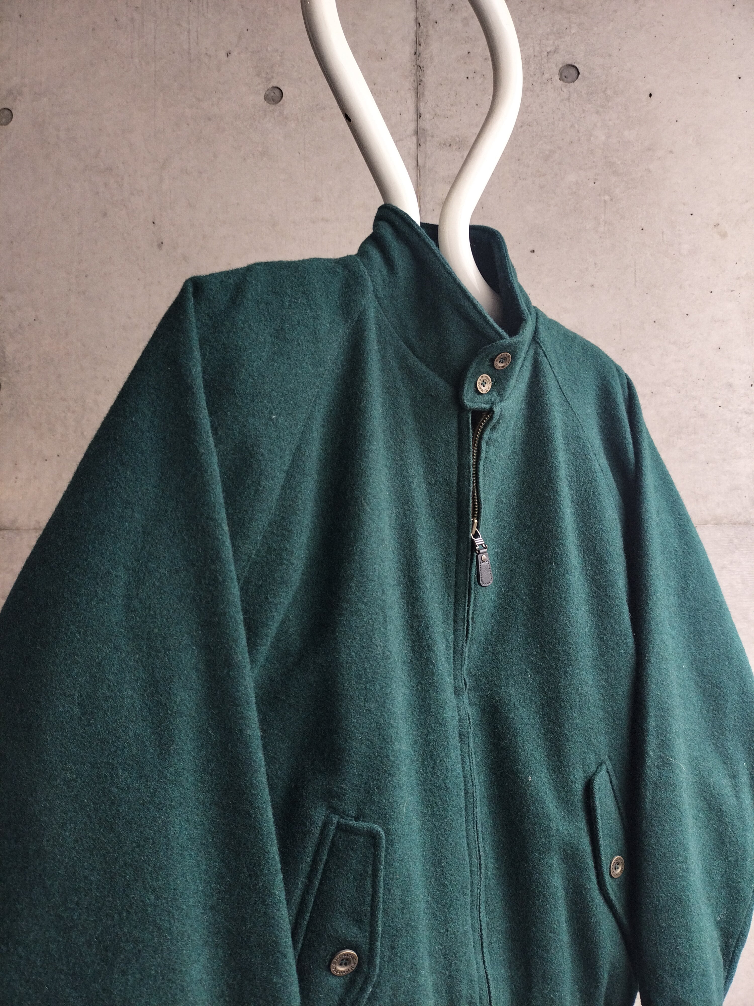 ダークグリーンのウールブルゾン。ハリントンジャケット型のブルゾンです。ジップはレザーチャーム。背面のアンブレヨークも◎。シルエットも文句無しです。