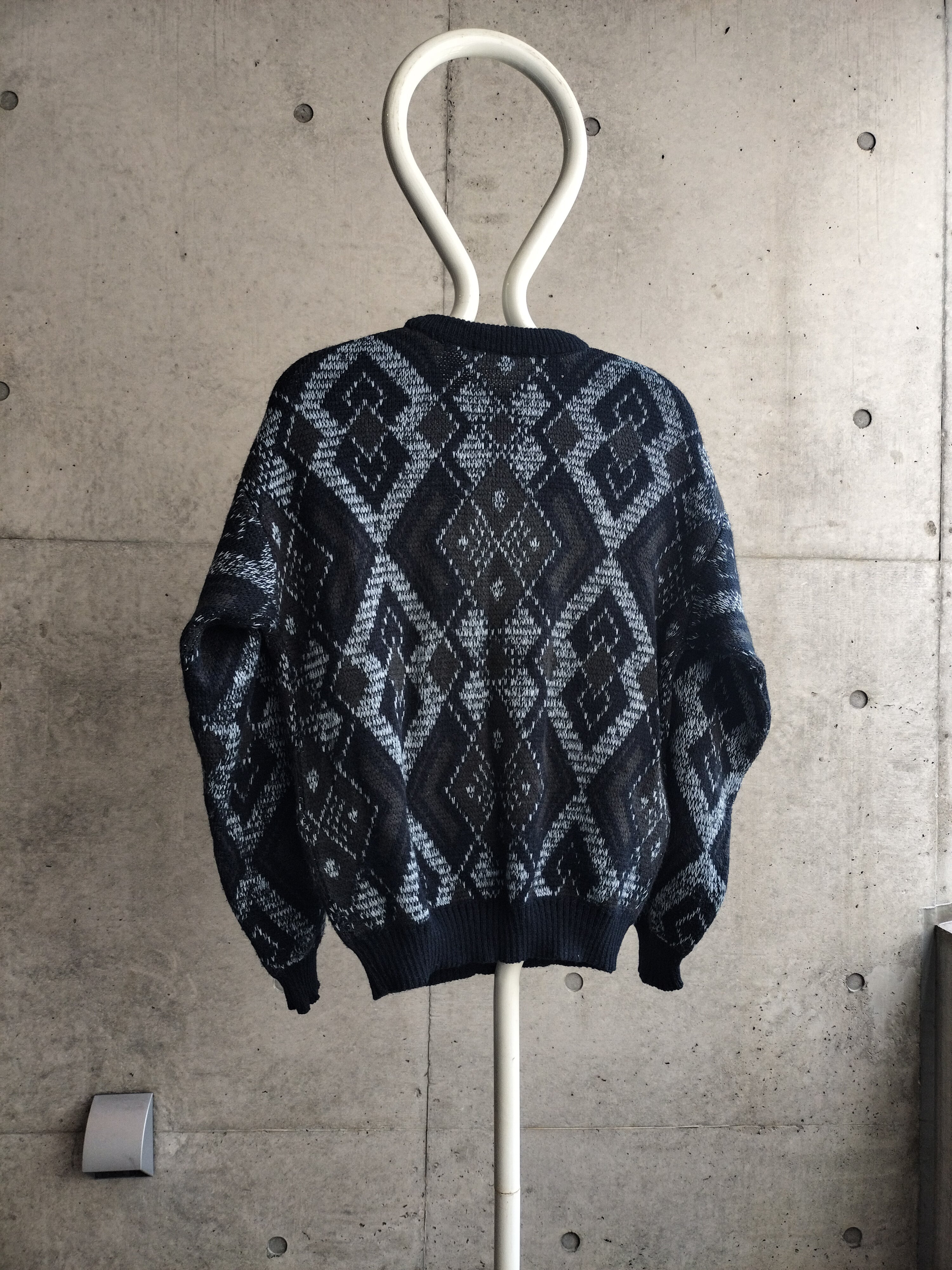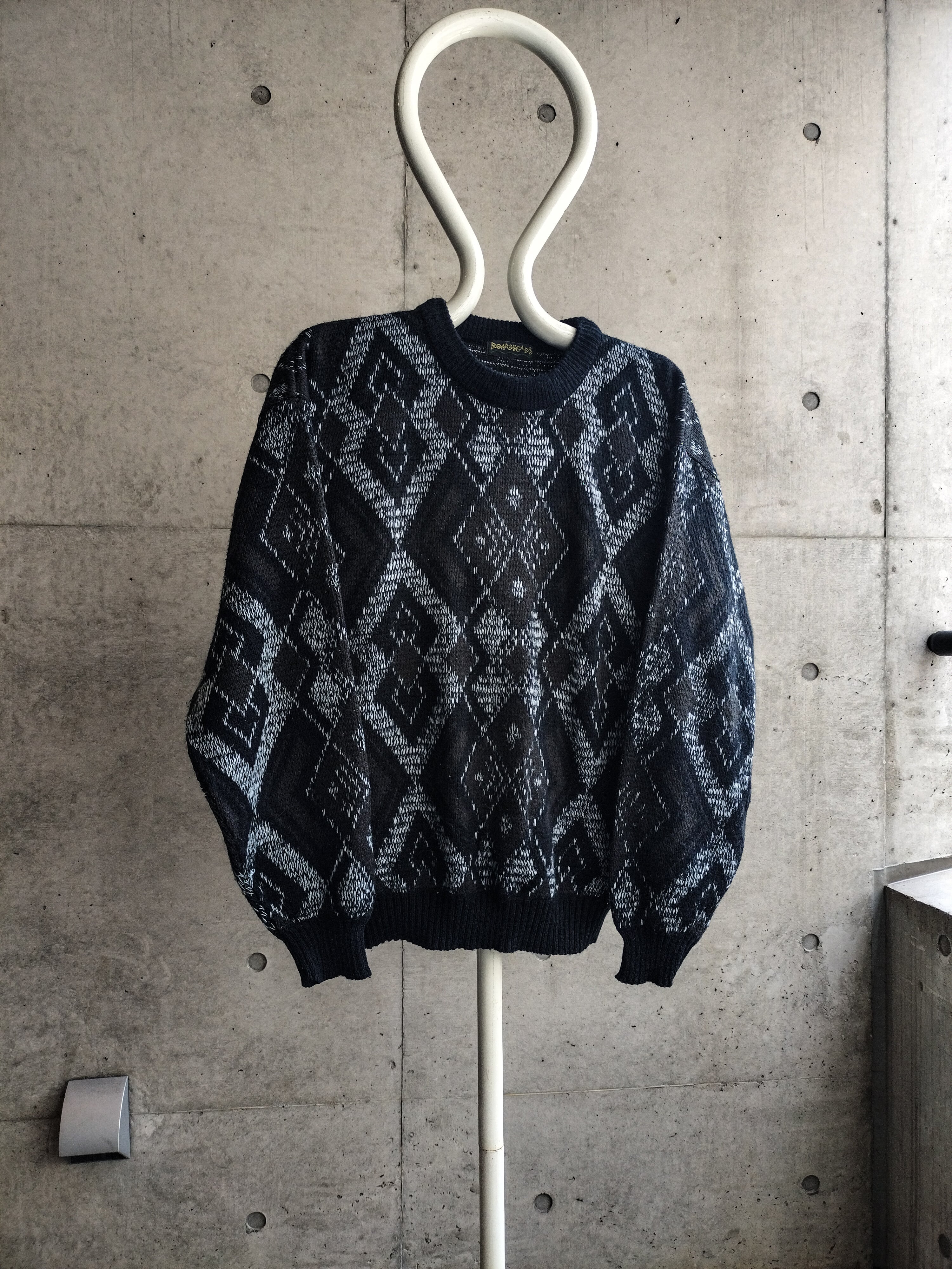 ブラックのジオメトリックデザインニット。シンプルにカッコいいです。案外探すとない黒、グレーのシンプルなカラー。シルエットも文句無しです。